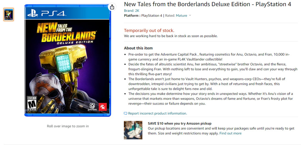 Quelque mois plus tôt Gearbox annonçait une suite a Tales from the Borderlands, spin-off de Borderlands sortie en 2014 qui exposait la fameuse formule narrative de feu Telltale Games. Alors prévu pour cette année, ce second opus n’avait cependant pas de date de sortie précise, ni même une véritable appellation; des infos qui pourraient bien nous avoir été dévoilé par Amazon.