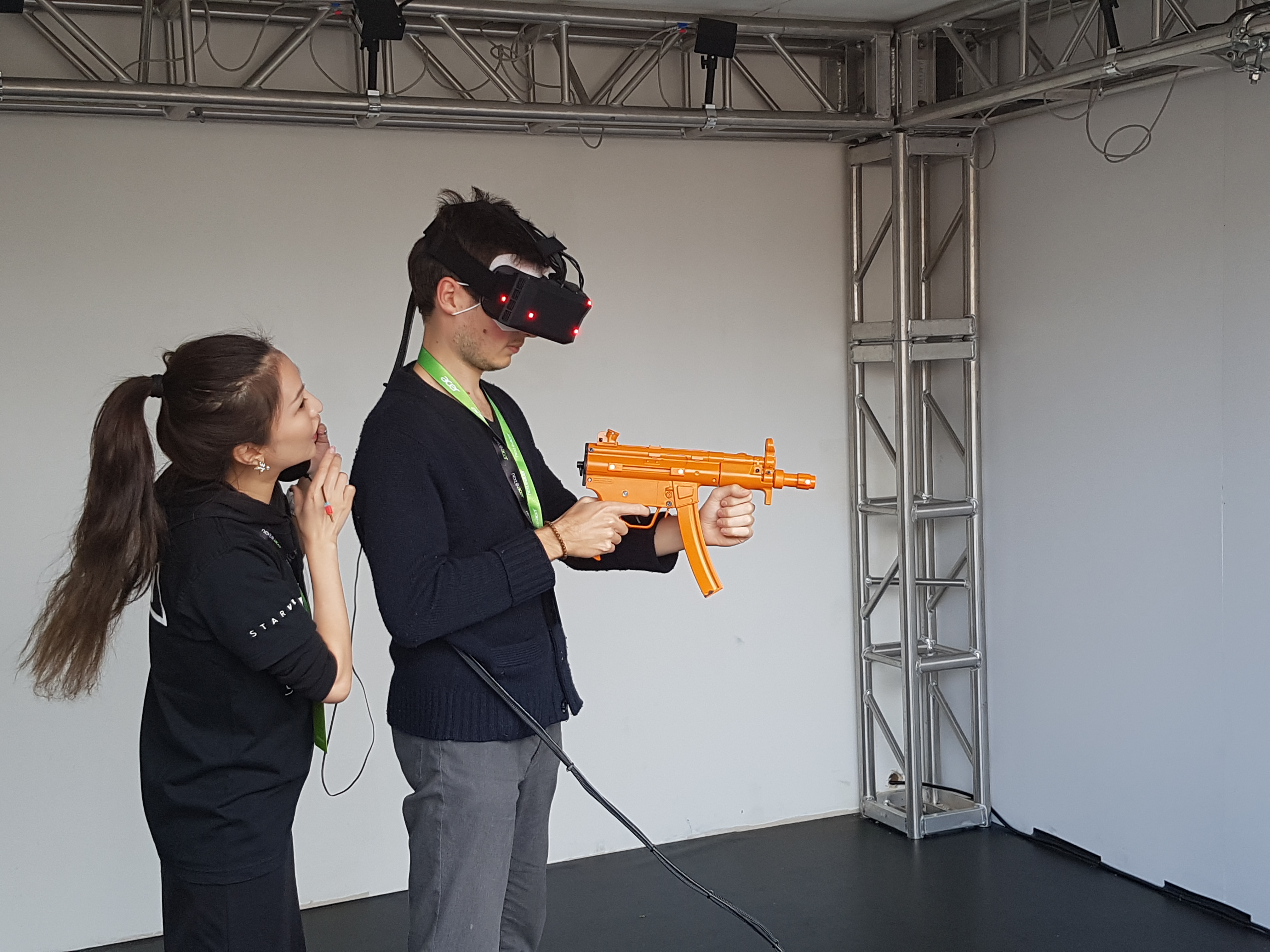 La deuxième démo portait sur John Wick Chronicles, jeu de shoot tiré du film du même nom. Justement créé par 505 Games, équipe de Starbreeze responsable de la licence Payday, c’est un soft que je possède déjà sur HTC Vive, dont la comparaison directe va être claire et pratique. L’avantage de la démo, en plus de la qualité du casque, est que le joueur est équipé d’une vraie MP5 en métal reconditionnée en capteur de jeu, histoire d’avoir une vraie prise en main réaliste et de montrer à quoi ressemblerait une session de jeu dans l’un des fameux futurs complexes IMAX VR. On dirait pas comme ça mais un petit PM, ça pèse son poids à force de l’épauler de manière répétée pour viser, et cela renforce grandement l’immersion.