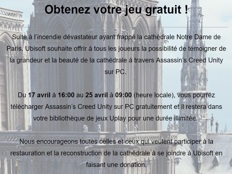 Ubisoft s’engage à verser 500 000 euros, afin de contribuer à la restauration et à la reconstruction de Notre-Dame de Paris. Ubisoft encourage également toutes celles et ceux qui le souhaitent à contribuer à cet effort collectif.