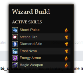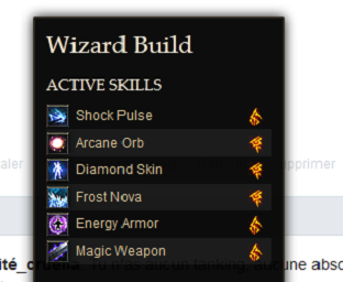Concernant le tooltip officiel de Blizzard sur le forum, il vous suffit simplement de coller un lien vers un objet, un calculateur de talents… notre forum se chargera du reste. Faites le test vous même : pour les joueurs de la classe Sorcier, vous pouvez me donner votre template sur ce post et vous verrez votre fiche en pop-up.