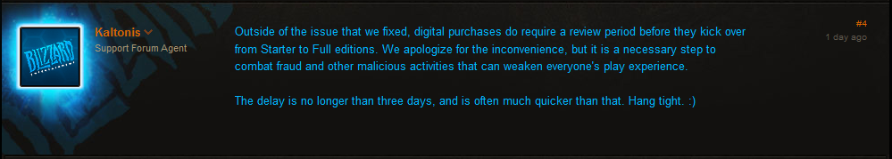 Une fois ce délai d’au plus 72h passé, l’ensemble des fonctionnalités s’en retrouvent débloquées. Blizzard explique cette modification de procédure par une mesure de sécurité :
