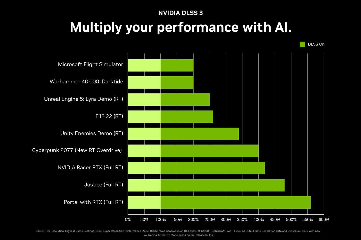 C’est le cas par exemple sur Cyberpunk 2077 en 2160p (4K) avec un nouveau mode de ray tracing extrême surnommé « Overdrive« , tournant à 20 FPS en moyenne sur une RTX 4090, à 60 FPS avec le DLSS 2.0, puis à 90 FPS en DLSS 3.0. De son côté, Flight Simulator 2020 voit son framerate en 2160p doublé grâce au DLSS 3.0, même avec le ray tracing actif.