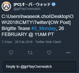 [EDIT 27/02 18h] Judge Hype a rapporté un nouvel indice intéressant trouvé sur Reddit mais qui relève plus de la fuite que du teasing. En effet, le Twitter japonais a posté le même message que les autres comptes Blizzard, mais le CM nippon avait l’air bien moins doué avec un ordinateur. Depuis supprimé, on pouvait lire sur le tweet le nom du fichier partagé qui s’appelle… Brigitte Tease !