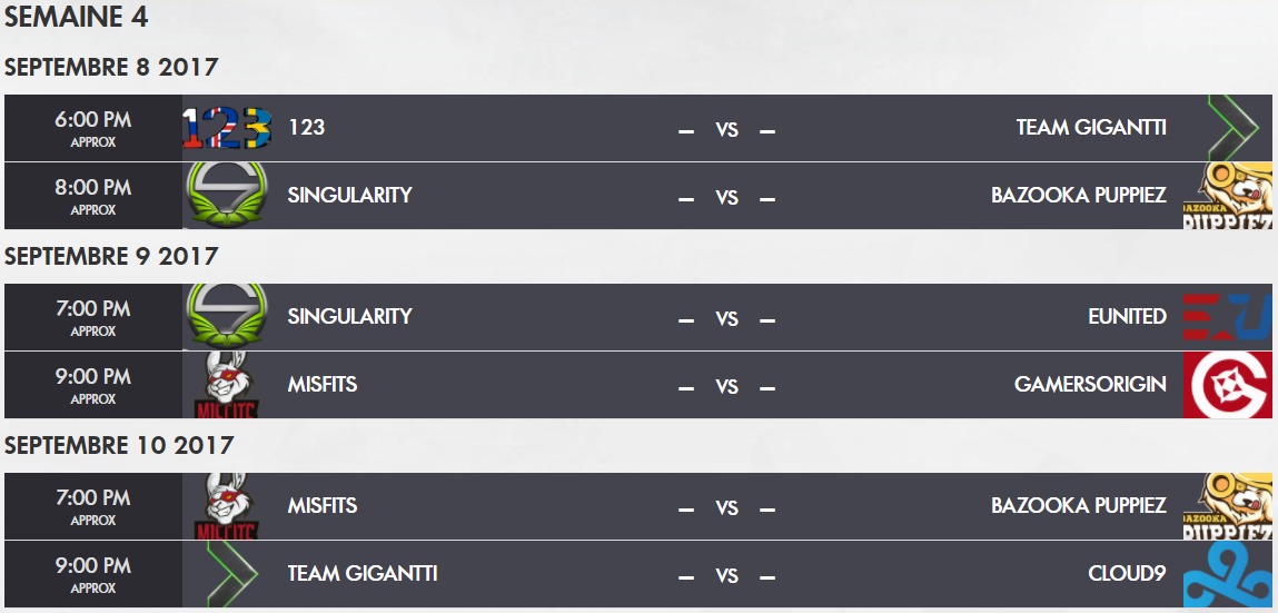 En Europe, les quatre premières équipes sont respectivement les Misfits (4-0), 123 (4-0), les GO (3-1) et les Gigantti (2-1). Les GO ont notamment créé la surprise en arrivant aussi haut dans le tableau, tandis que les Singularity, qui étaient attendus dans les premiers, n’ont pas encore réussi à remporter une seule victoire, tout comme les Bazooka Puppiez et les EUnited. Ainsi, pour notre seule équipe française, les Gamers Origin, la qualification pour les play-offs est assurée, à moins qu’ils ne fassent deux défaites, et encore (le match le plus compliqué pour eux sera celui contre les Misfits, le 9 septembre).
