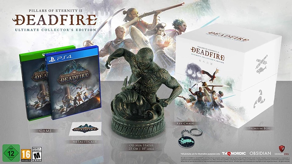 Pillars of Eternity 2: Deadfire — Ultimate Edition peut être trouvé au prix de 59,99 euros pour la version standard, et 129,99 euros pour la version collector qui inclut une statuette « Od Nua », un sticker métallisé ainsi qu’un porte-clé.