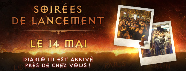 Venez participer à des évènements d’une proportion cataclysmique qui se dérouleront partout en Europe pour fêter le lancement de Diablo III. Le jeu sera disponible dès minuit, dans la nuit du 14 au 15 mai, alors soyez parmi les premiers à mettre la main sur la superbe boîte de l’édition collector !