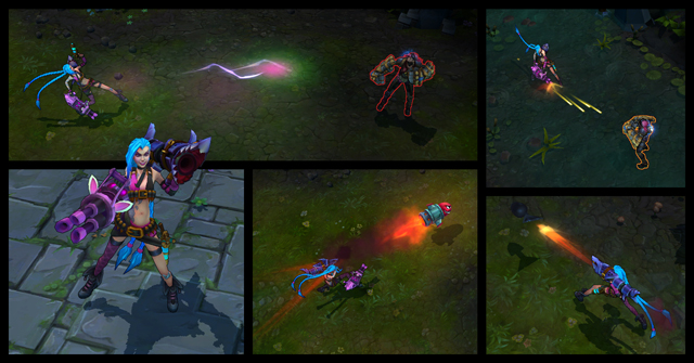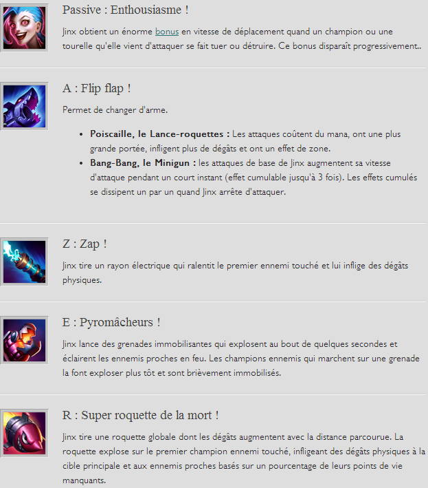 « Jinx est un tireur polyvalent possédant tout une panoplie d’armes éclectiques. Ses différentes armes sèment la destruction et lui permettent d’infliger des dégâts colossaux, au détriment de sa mobilité. Flip flap ! est l’une des choses les plus importantes à maîtriser quand on joue Jinx ; vous devez harceler les ennemis de loin avec le lance-roquettes, sans prendre de risques, puis déchaîner votre minigun au moment opportun.