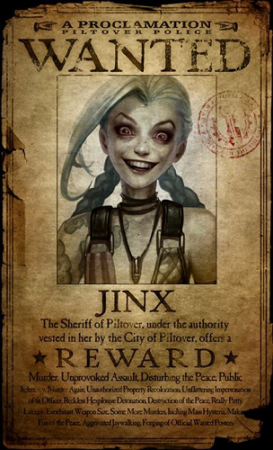 Au fur et à mesure que les crimes sans queue ni tête frappaient la ville, on finit par apercevoir la coupable. Les origines de la jeune femme restaient un mystère, mais certains croyaient voir des traces de technologie Hextech de Piltover dans ses armes, tandis que d’autres croyaient déceler l’influence de la mode de Zaun dans ses vêtements. Comme son arrivée était toujours synonyme de problèmes, ceux qui croisèrent sa route finirent par lui donner un nom : Jinx.