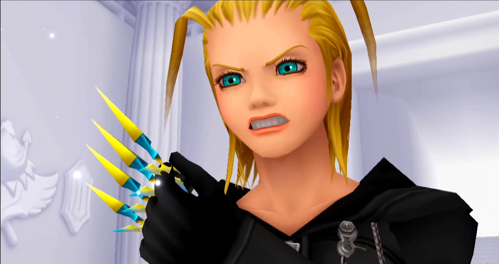 Tandis qu’ils se dirigent vers l’étage suivant, l’électrique Larxene intervient pour « s’amuser » avec Sora. Celle-ci fait en sorte qu’il se « souvienne » de la personne lui ayant donné le porte-bonheur qu’il tient autour du cou. Sora finit par se rappeler qu’il s’agit de Naminé, retenu dans les fins fonds du manoir. Un rapide combat entre notre héros et la nymphe furieuse s’en suit, jusqu’à que cette dernière s’enfuie après lui avoir donné d’autres cartes mondes.