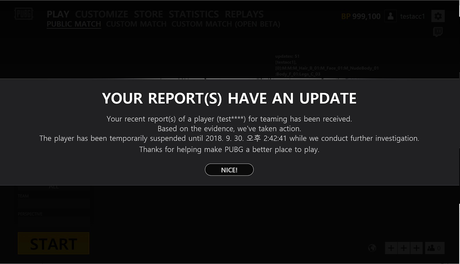 Dans les trucs qui font plaisir, une notification informera le joueur quand son signalement d’un tricheur a été utile lors d’un verdict. Histoire de se rendre compte que signaler un joueur suspect n’est jamais vain et qu’un signalement sans retour est sûrement dû à une surréaction du joueur qui vient de se prendre une balle de Kar98 à 500m en pleine tête… alors que c’était mérité.