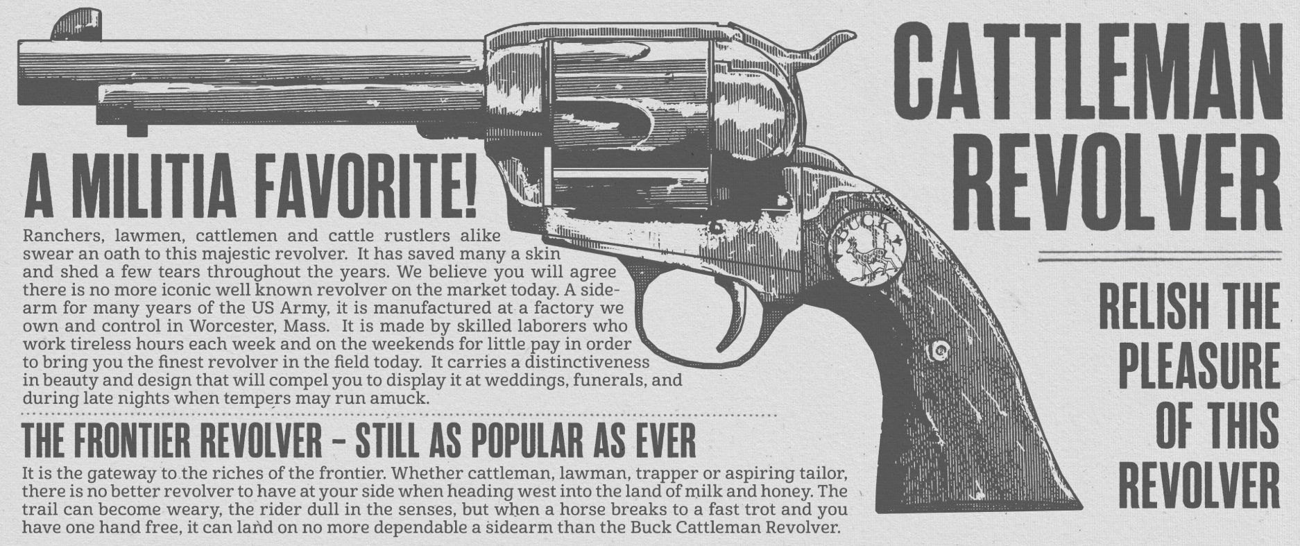 Vos armes seront stockées dans la sacoche de votre cheval, mais vous aurez un choix limité quand vous mettrez un pied à terre. Différents fourreaux vous permettront de changer de style de combat, comme un revolver à chaque main, et ceux de meilleure qualité protégeront vos pétoires des éléments externes et freineront leur détérioration.