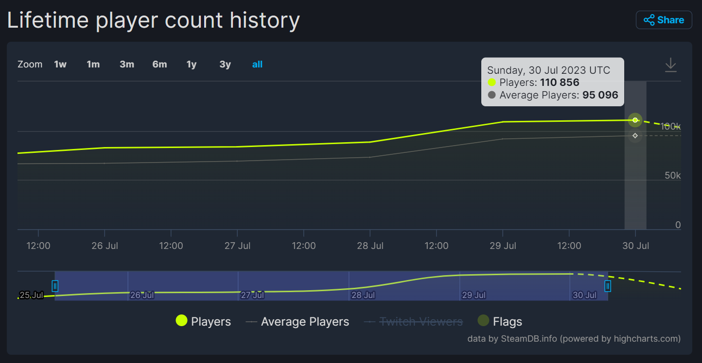 Sorti le 25 juillet, il semblerait que Remnant II profite d’un sacré effet de bouche-à-oreille, dont le nombre de joueurs connectés en simultané ne cesse de progresser depuis, ayant atteint les 110 856 connexions dans la journée du dimanche 30 juillet.