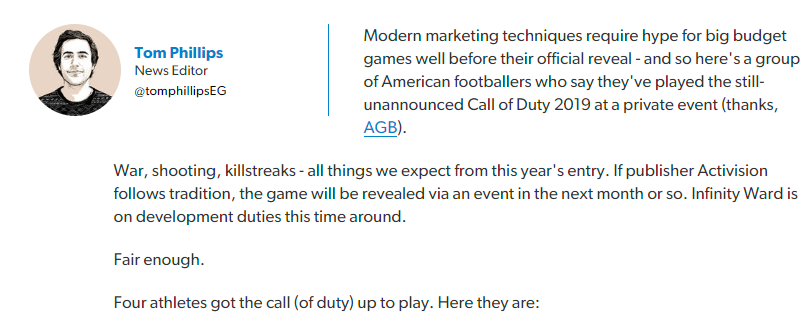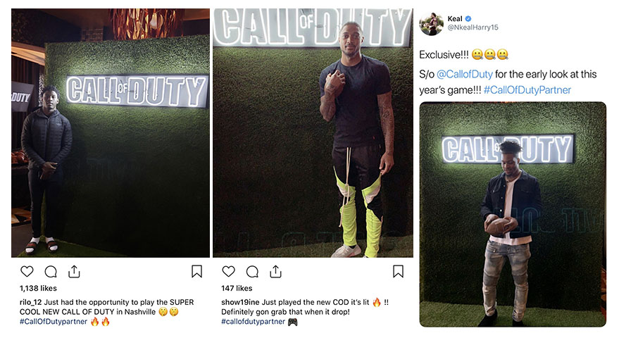 Dans le cas actuel, Eurogamer rapporte que des footballers américains ont été invités à tester le prochain Call of Duty en avant-première à Nashville. Bien sûr, les athlètes se sont empressés de partager cette nouvelle sur leurs réseaux sociaux, mais pas un mot de la part d’Activision. Pourtant, l’éditeur n’en est pas à son premer coup d’essai, puisque pour Black Ops 4, des joueurs de NBA avaient été aperçus avec des casquettes arborant le logo du titre, alors que ce dernier était encore gardé secret. Du vrai marketing peu subtil comme on l’aime.