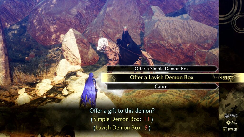 Finie la solitude, un démon pourra maintenant vous accompagner directement sur le terrain en tant que « navigateur » : il ne participera pas aux combats mais vous préviendra si vous passez à côté d’un Rail de Magatsuhi ou d’un objet quelconque. Et ce n’est pas fini, dans un élan un peu bizarre, Atlus a également rajouté des « Demon Haunts« , pour, euh, taper la discute avec ses démons, les prendre en photos ou leur offrir des cadeaux, comme dans un dating game démoniaque.