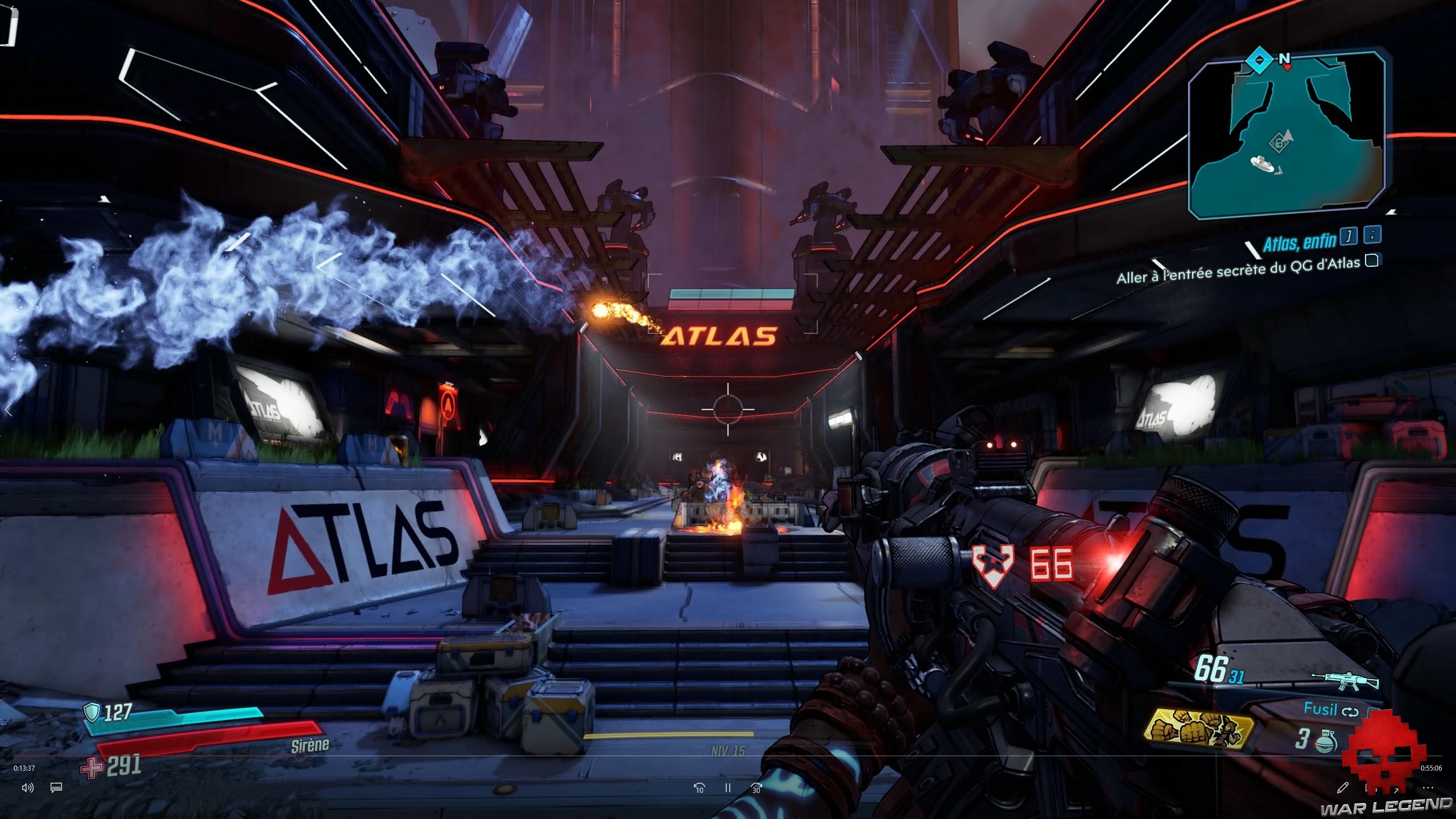 Lorsque vous êtes entré, avancez tout droit jusqu’à une grande cour devant le bâtiment d’Atlas. Il se trouve que Katagawa a déployé les troupes de Maliwan pour assaillir le QG ; tandis que vous aidez les forces d’Atlas, le centre de contrôle des défenses se prend un missile dans les dents, rendant inopérantes les tourelles de la base.