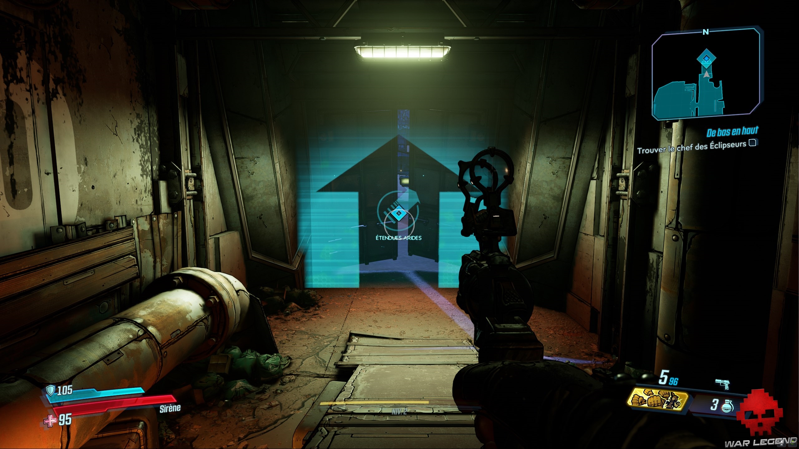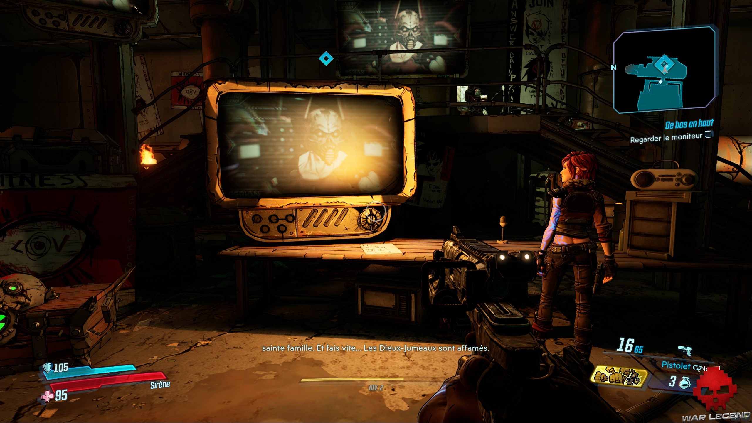 Vous finissez par arriver à une porte — que Lilith vous ouvre — donnant à une pièce où se trouve un moniteur. En le regardant, vous apprenez qu’un clan a trouvé la carte que recherche Lilith et qu’il s’apprête à la livrer aux jumeaux Calypso, les individus à la tête des DDA. Prenez le temps de fouiller la salle pour récupérer un peu de munitions et de butin, puis prenez la sortie vers Étendues arides qui se trouve sur la gauche.