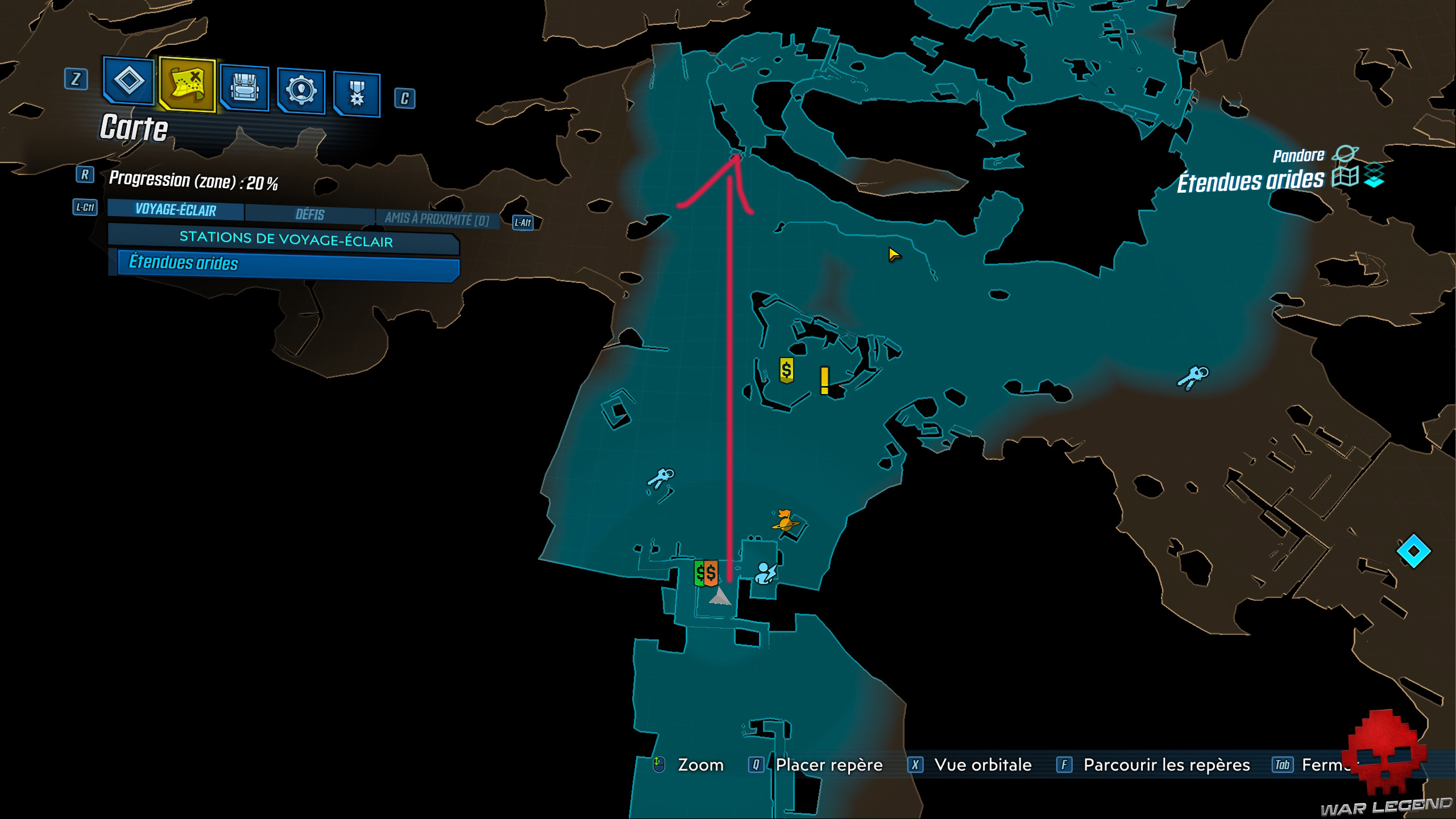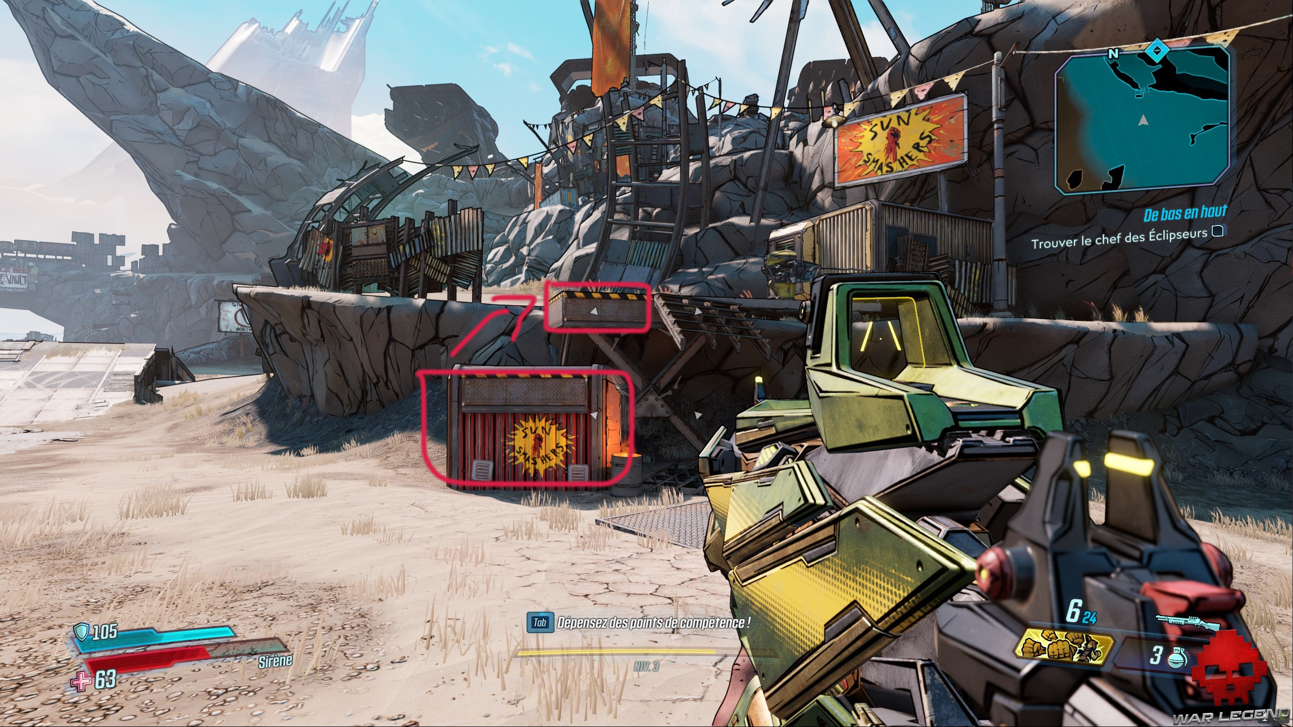 Depuis le QG des Pillards Écarlates, prenez la direction du nord. Vous finirez par apercevoir un petit container et un morceau d’escalier. Escaladez-les pour pouvoir continuer vers l’antre des bandits que vous recherchez.
