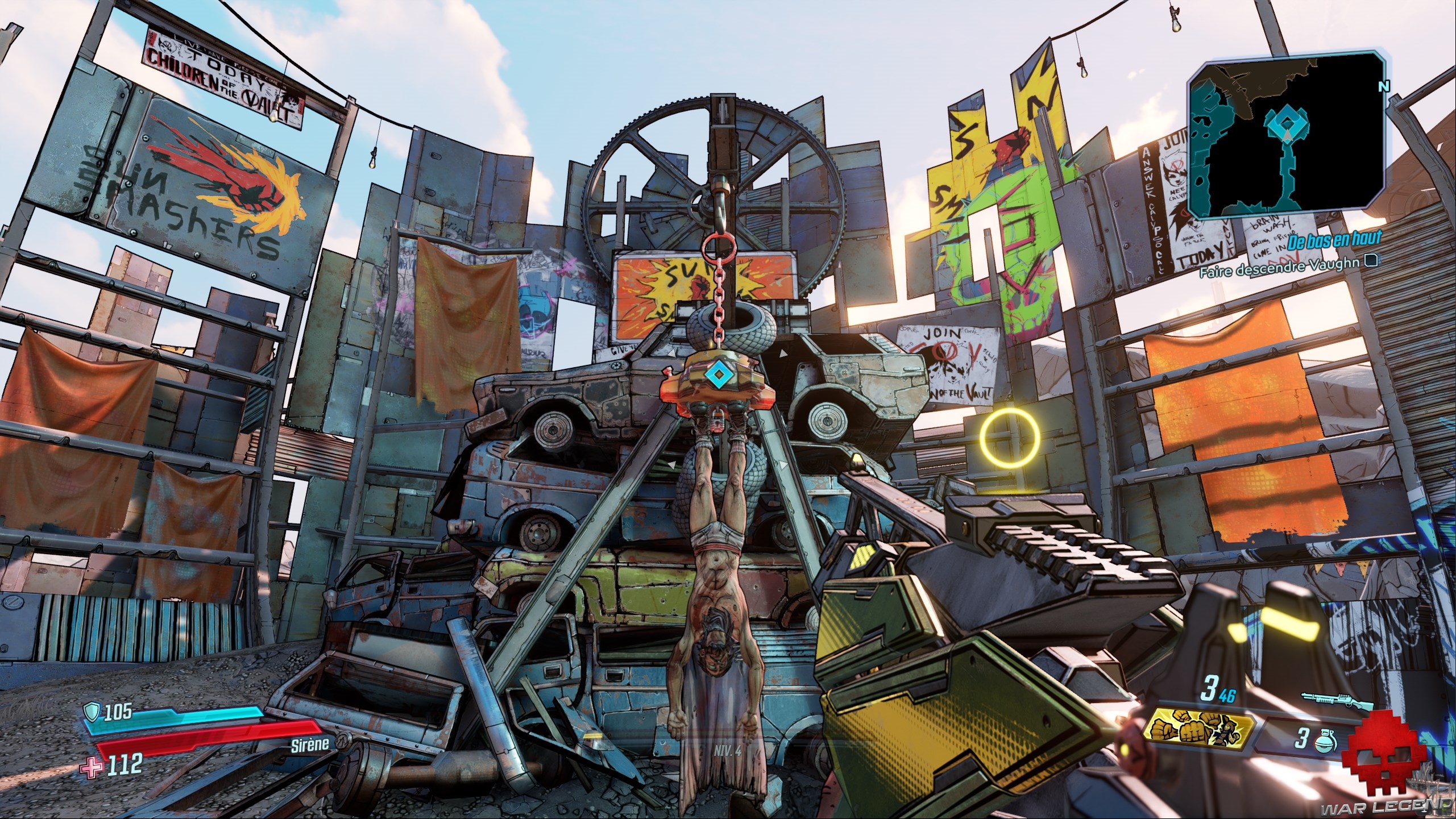 Une fois entré, vous tombez nez à nez (enfin, pas vraiment avec le nez) avec Vaughn, un bandit introduit dans le dernier DLC de Borderlands 2 Commandant Lilith et la Bataille pour Sanctuary. Tirez sur la chaîne pour le délivrer.