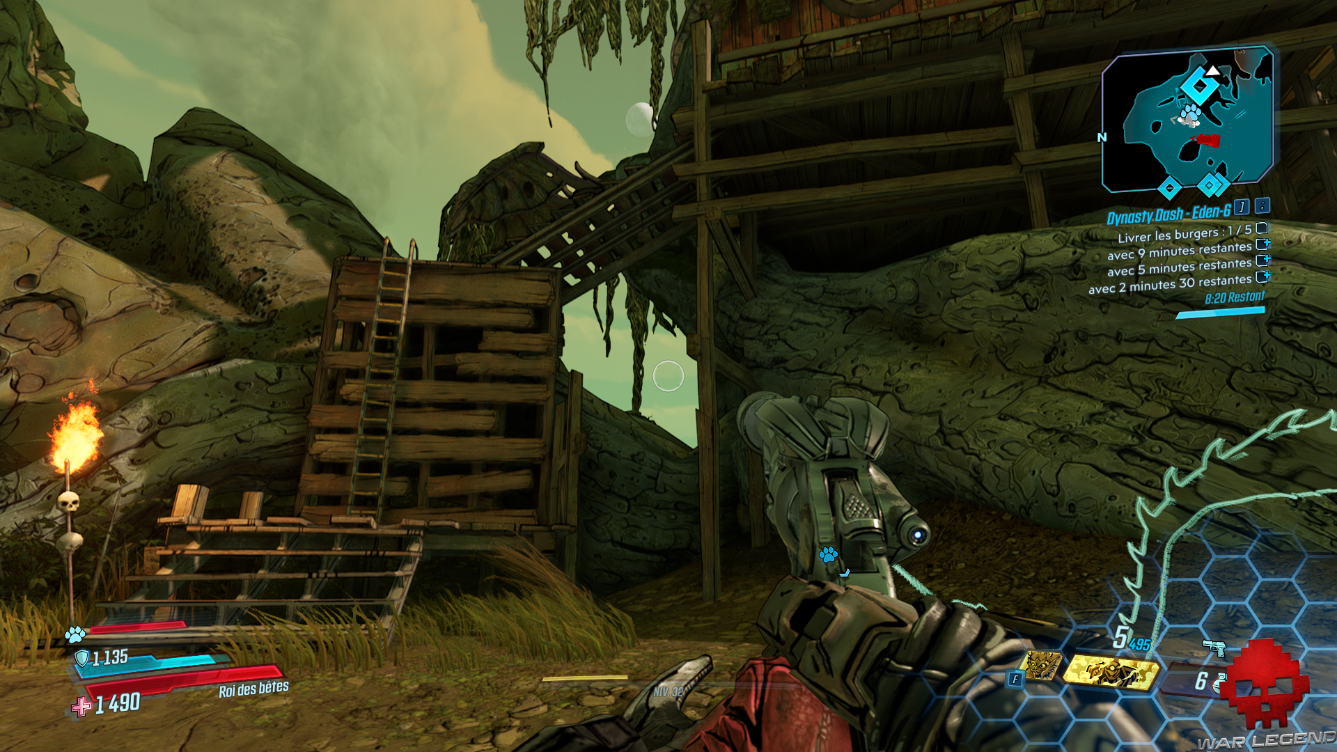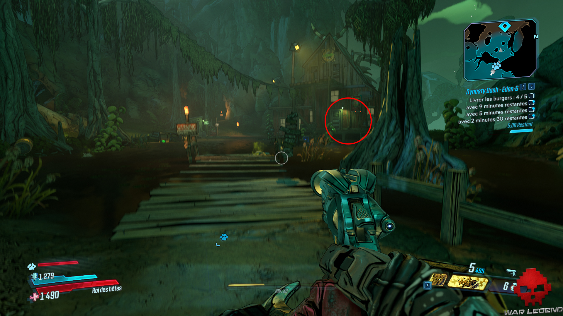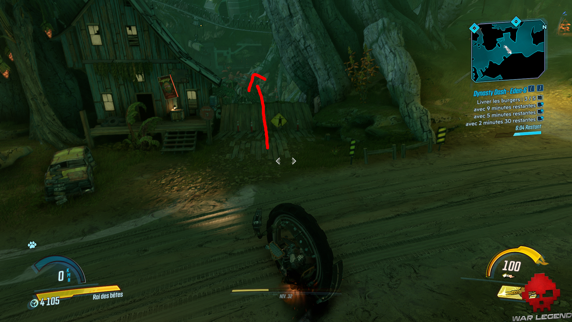 Ensuite, récupérez le burger sur le stand derrière vous et préparez-vous à courir vite. Prenez un véhicule à la station auto-loc et sortez tout de suite à gauche. Continuez vers l’est, puis tournez à droite une fois arrivé à l’épave. Dirigez-vous vers la cabane.