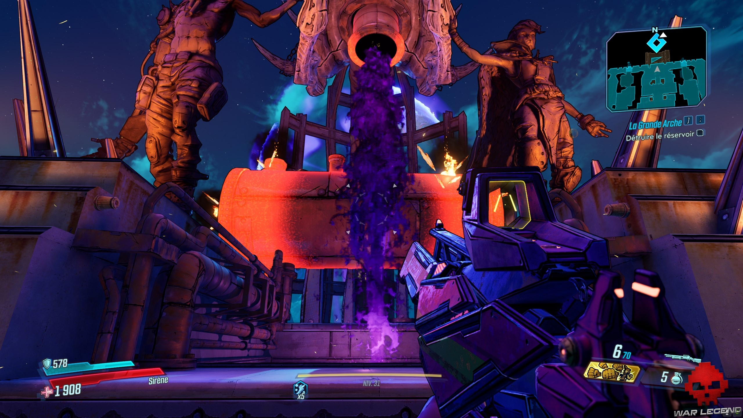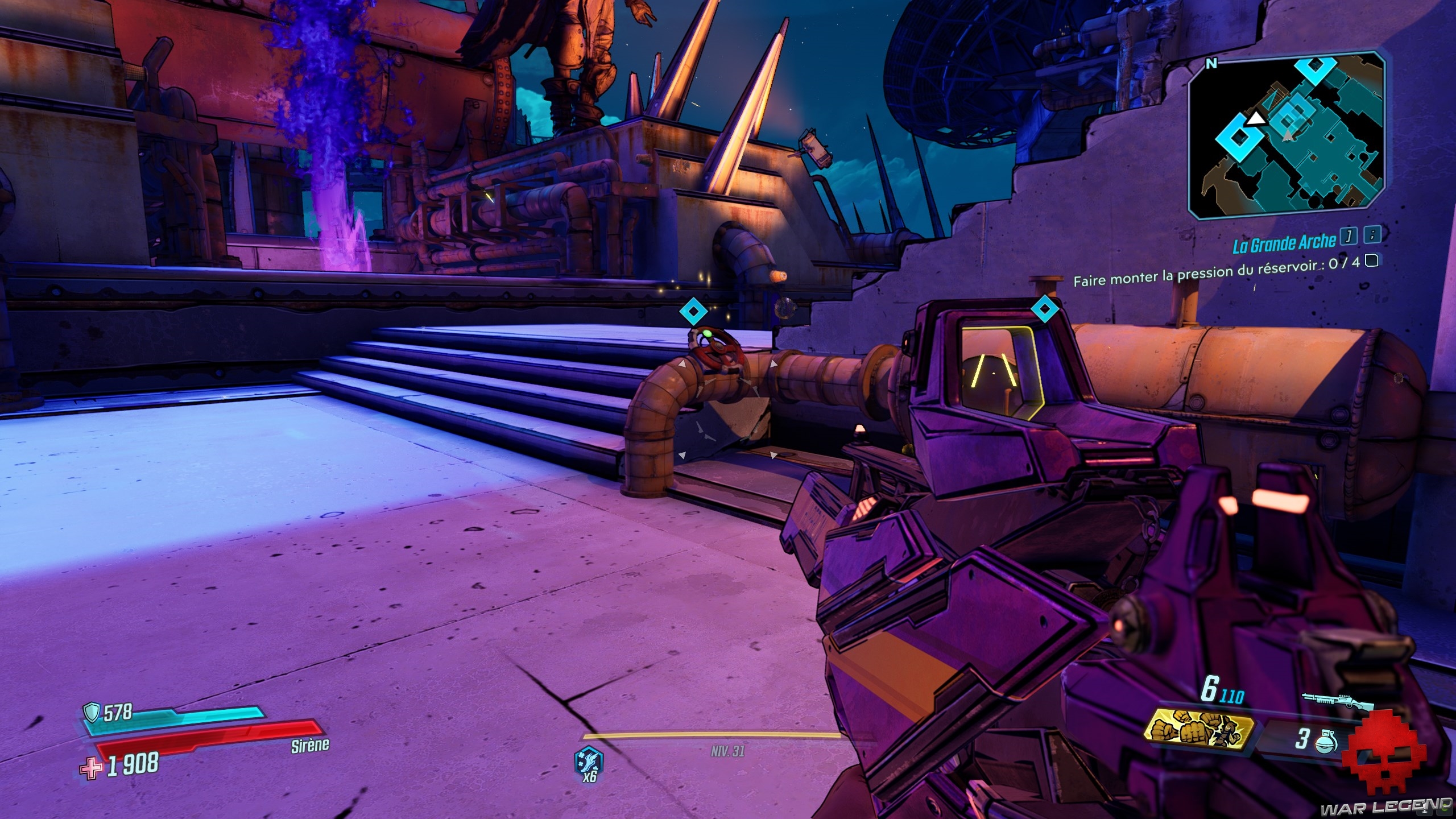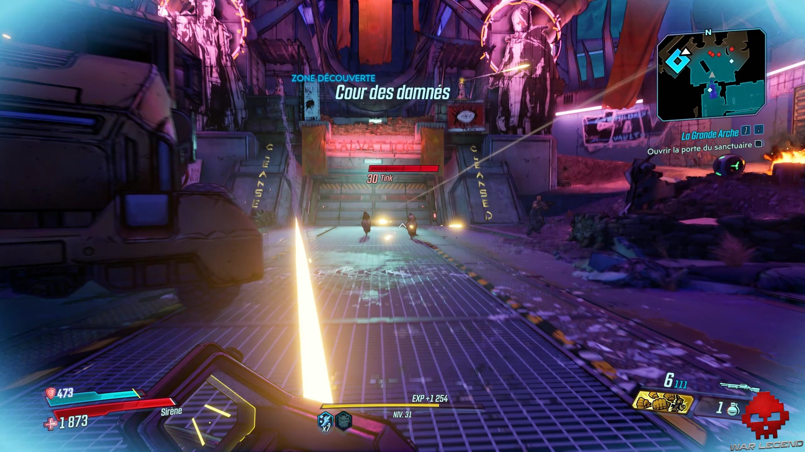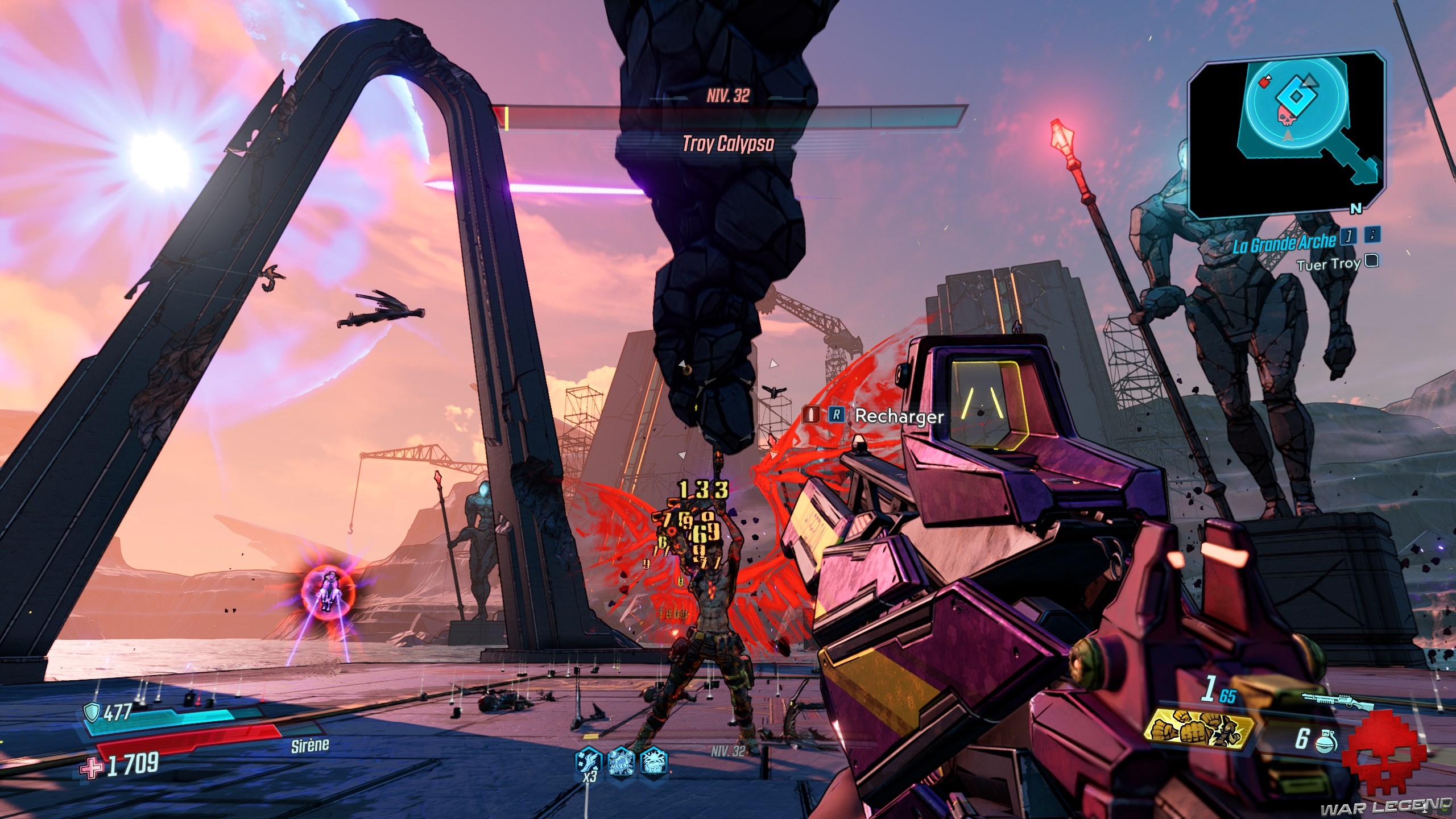 Dès que vous les avez toutes actionnés, revenez au centre et tirez sur le gros réservoir (marqué en rouge). Sautez dans le trou du bassin d’éridium et entrez dans la zone de La Grande Arche. Allez tout droit, jusqu’a arrivé à Troy, le boss de cette quête.