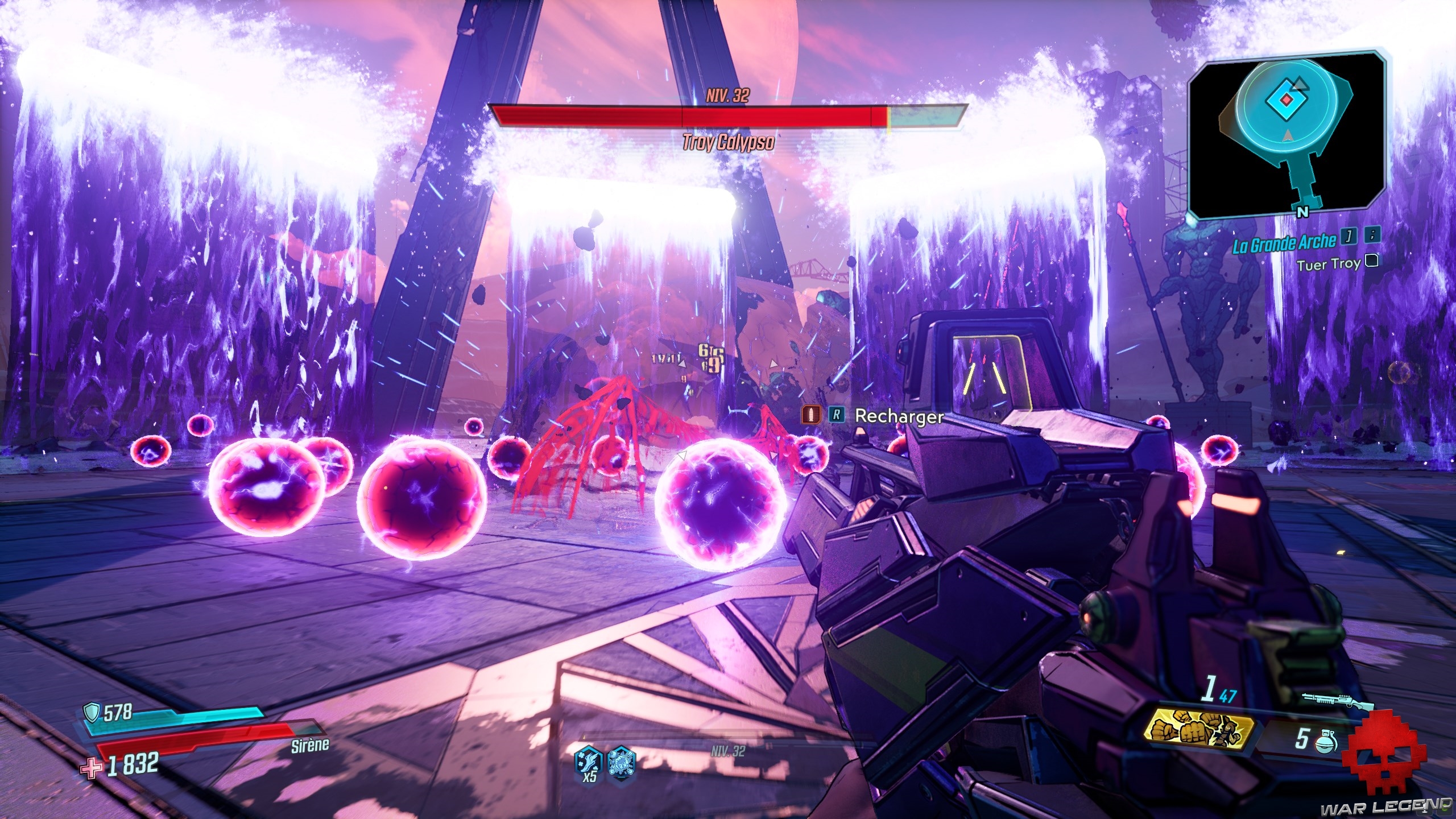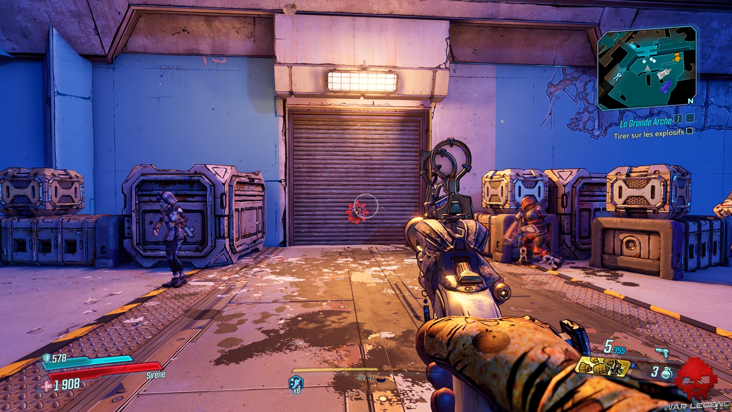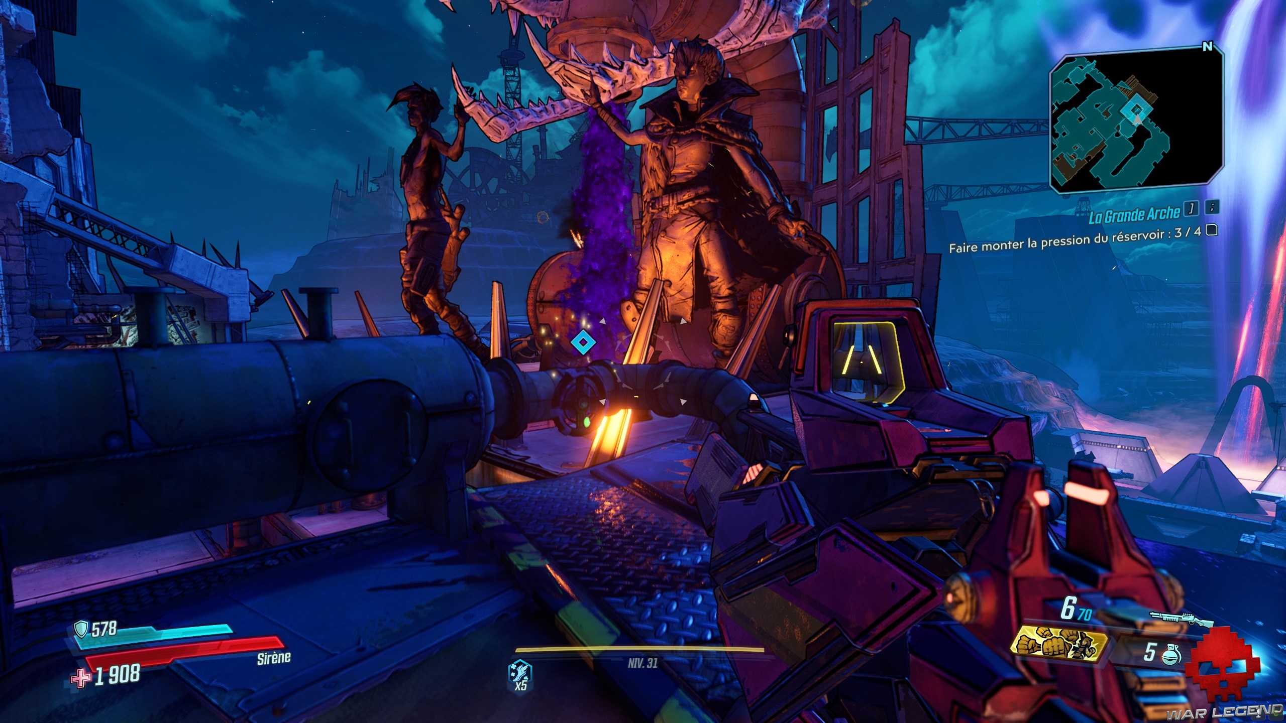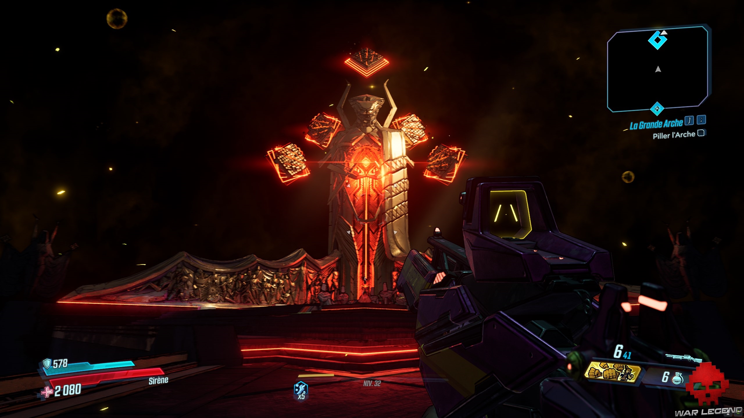 Dès que vous les avez toutes actionnés, revenez au centre et tirez sur le gros réservoir (marqué en rouge). Sautez dans le trou du bassin d’éridium et entrez dans la zone de La Grande Arche. Allez tout droit, jusqu’a arrivé à Troy, le boss de cette quête.