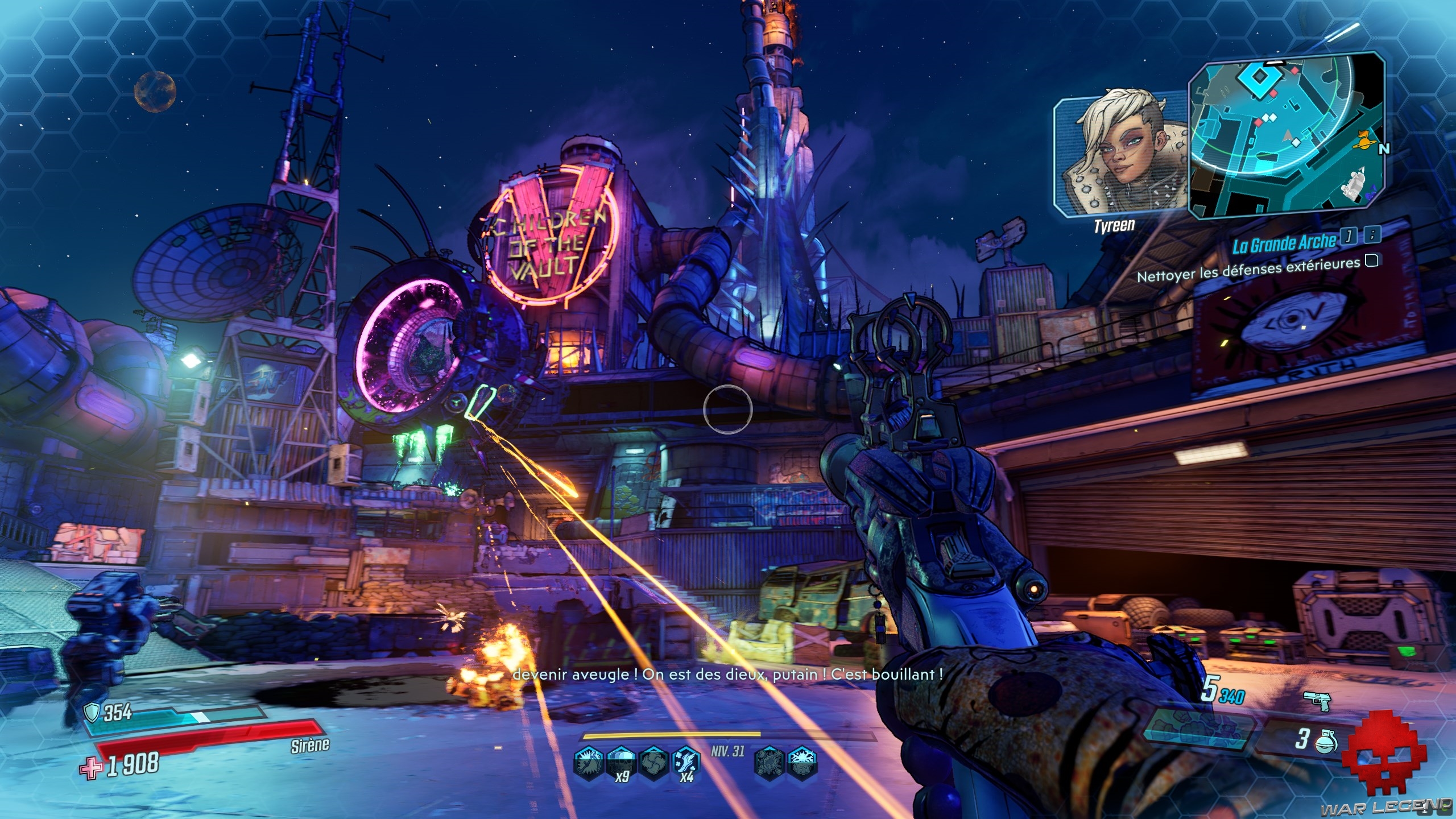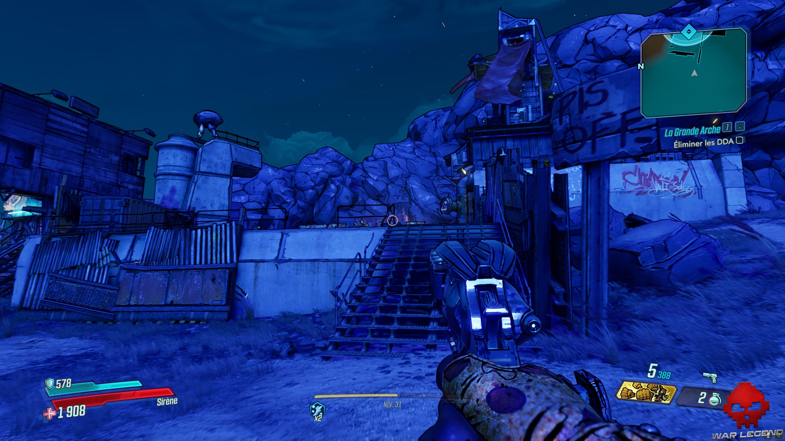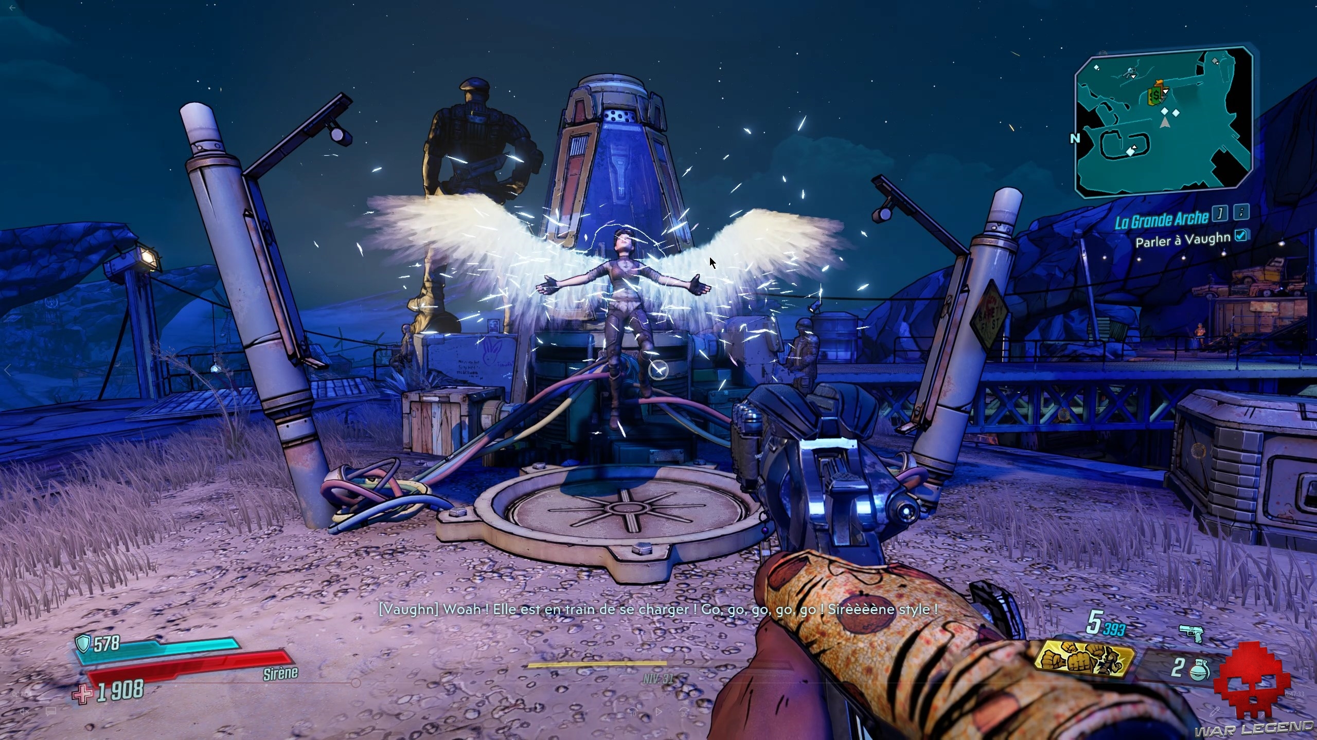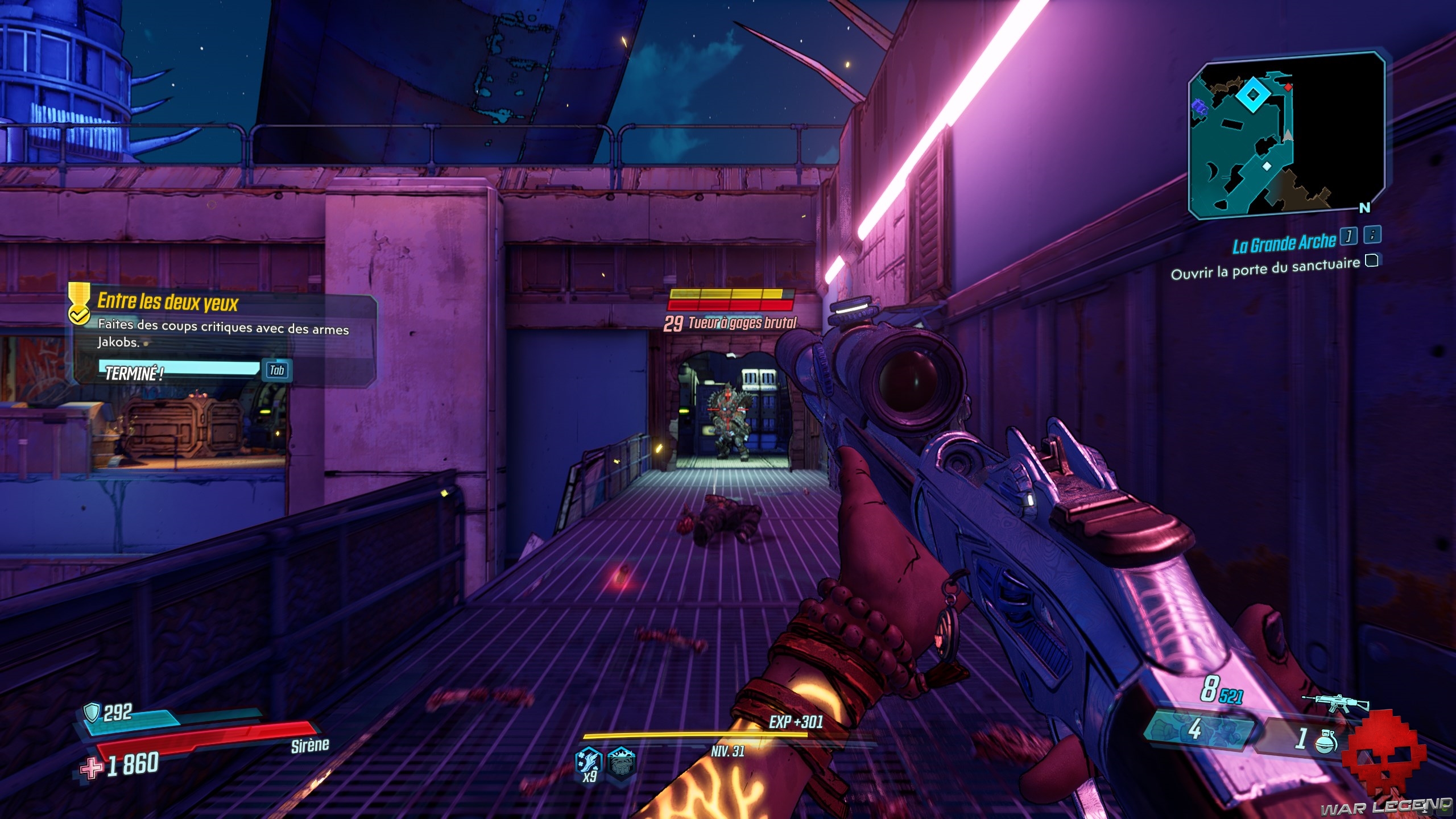 Dès que vous les avez toutes actionnés, revenez au centre et tirez sur le gros réservoir (marqué en rouge). Sautez dans le trou du bassin d’éridium et entrez dans la zone de La Grande Arche. Allez tout droit, jusqu’a arrivé à Troy, le boss de cette quête.