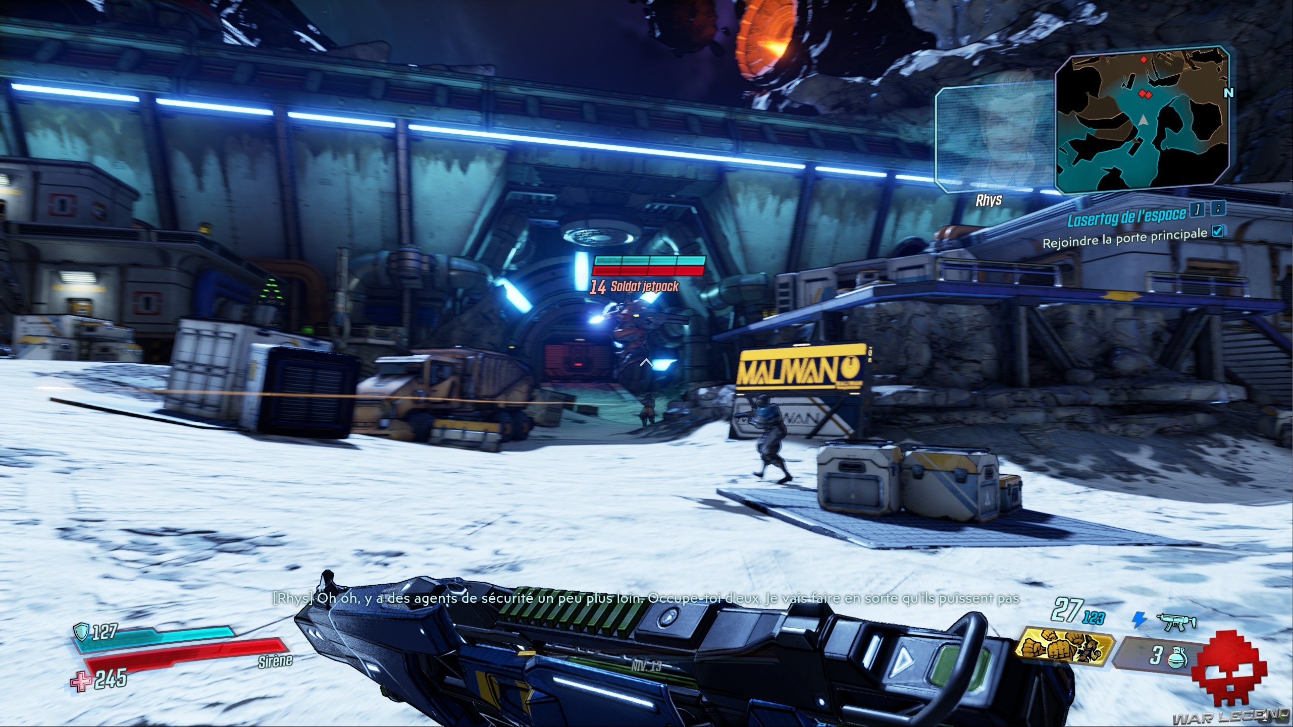 De retour d’Athénas après avoir récupéré l’un des 3 fragments de clé de l’Arche, vous êtes contacté par Rhys (et sa moustache de guerre). Celui-ci demande de l’aide concernant Maliwan, dont le président a installé un laser géant sur un astéroïde et menace de s’en servir sur le QG d’Atlas. Ledit Laser serait d’ailleurs alimenté par un fragment de clé.