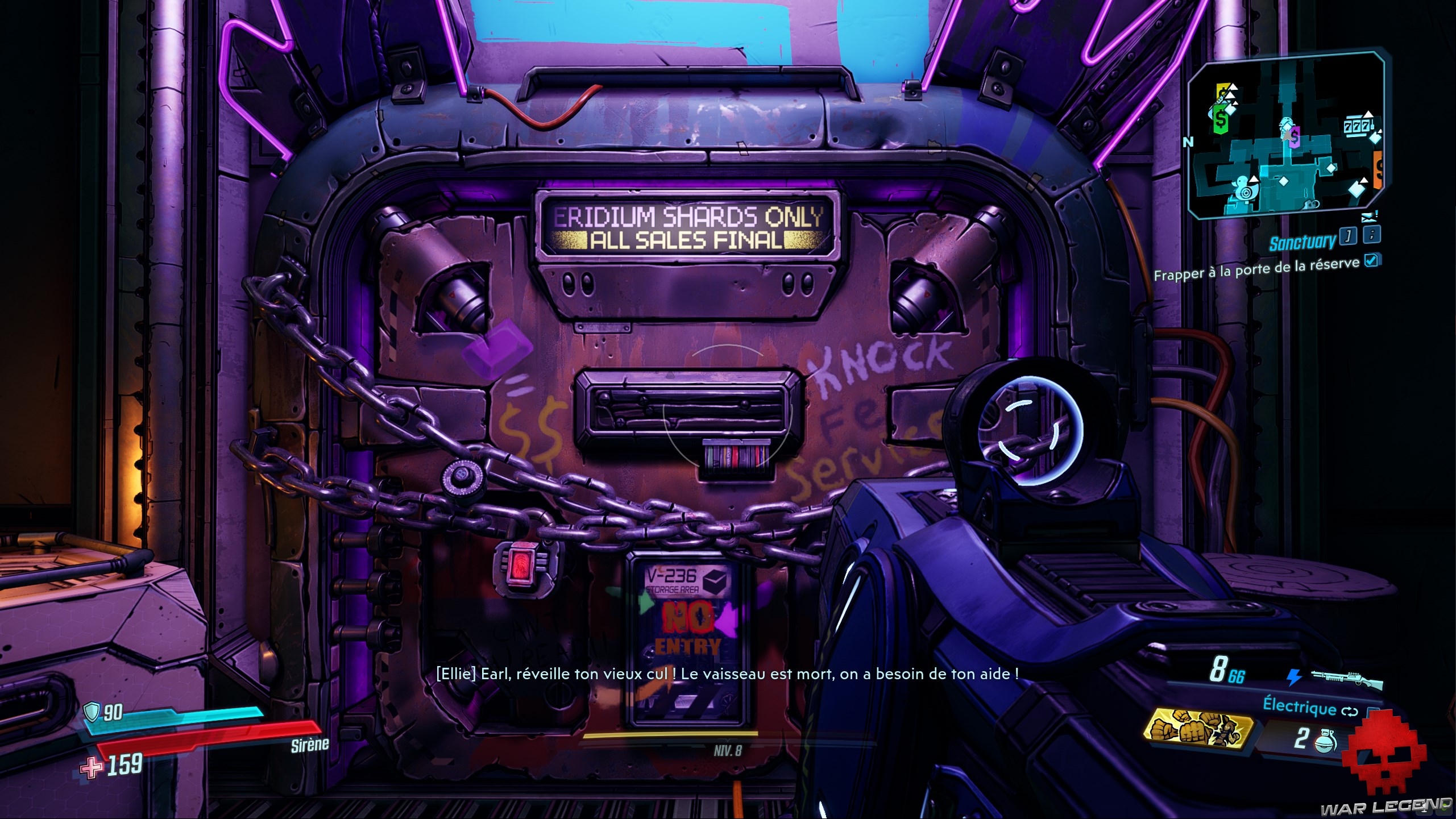 Évidemment, même pas temps de crise, certains refusent de vous aidé sans compensation. Earl ne jurant que par l’éridium, vous devez vous en procurer pour qu’il vous donne son accélérateur entropique. Il vous faut donc aller à la rencontre de Moxxi dans son bar. La porte de Earl derrière vous, prenez les escaliers sur votre gauche. Une fois en haut, allez directement à droite et vous devriez rapidement apercevoir l’enseigne du bar.