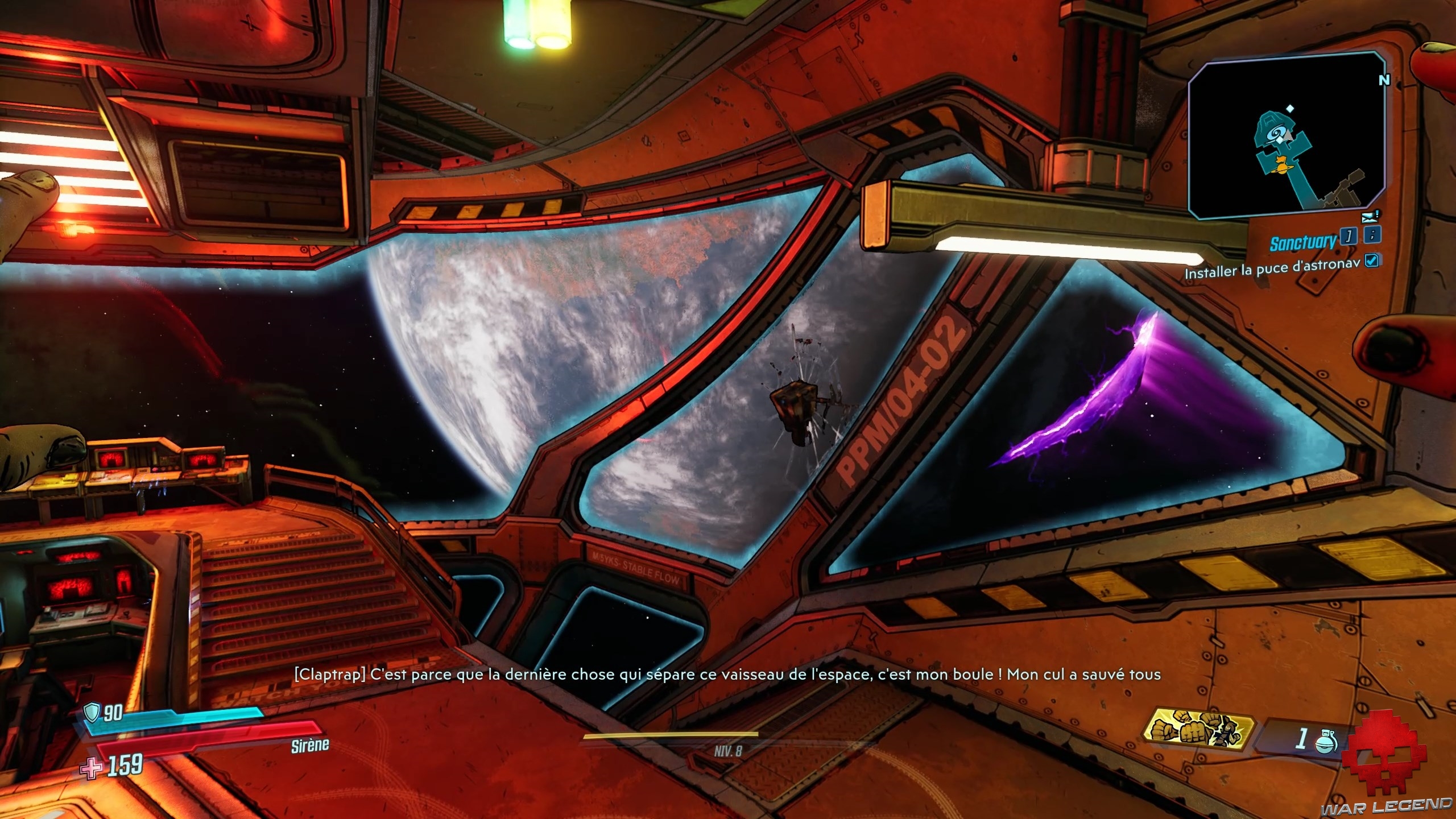 Pas de bol, Claptrap est aussi à bord ; le petit robot fait encore des siennes en bousillant le moteur du vaisseau (récemment nommé santuary). Il cause une faille dans la coque également, qui vous aurez mis dans la panade s’il n’avait pas sauvé la mise avec… son boule.