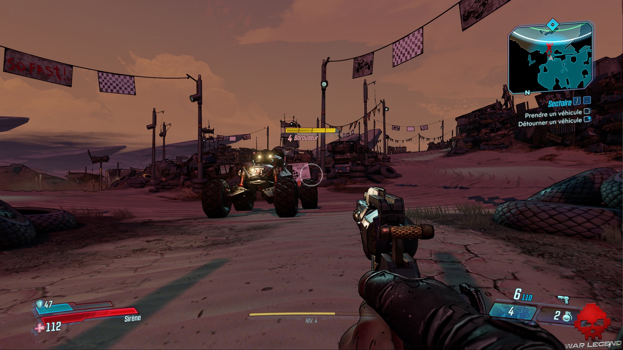 Un peu de résistance vous attend en chemin, mais rien de bien méchant. Une fois proche de la zone marquée, vous devriez apercevoir deux Baroudeurs ; vous devez vous en saisir d’un, sachant que vous avez un objectif bonus qui est de « détourner un véhicule ». Il faut juste réussir à s’approcher de l’un deux et appuyer sur la touche assignée (« E » par défaut sur PC) pour carjacké le bolide façon GTA. Autrement, vous avez la possibilité de coller une bastos entre les deux yeux du conducteur. Ça marche aussi.