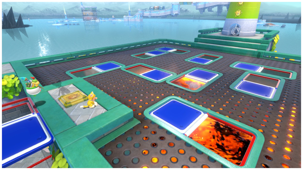 À l’instar de certains niveaux de Super Mario 3D World, le Château des Chatières est constitué de plateformes qui pivotent à chaque fois que Mario saute. À peine arrivé dans l’arène principale, vous mettez ce principe à exécution face à des ennemis invincibles.