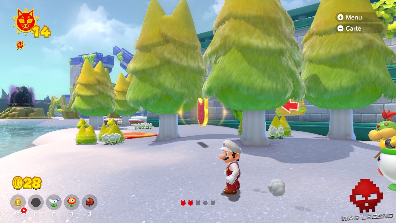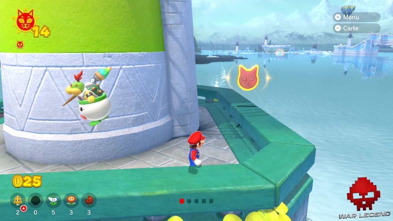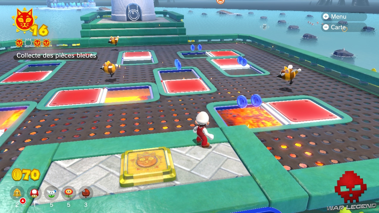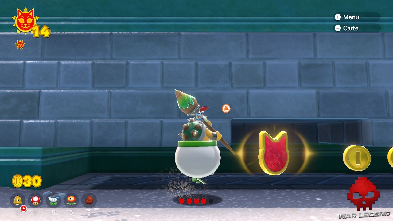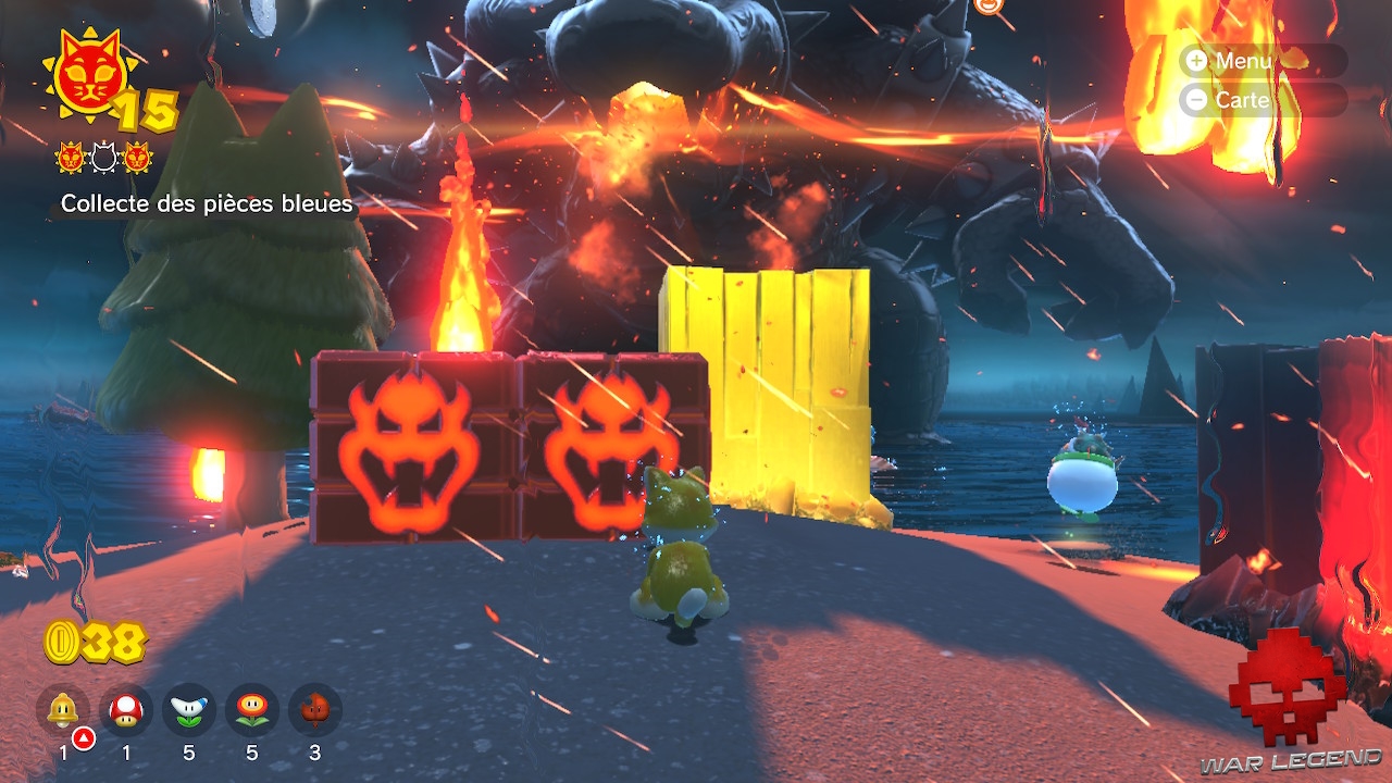 En explorant les parcours, vous remarquerez de temps en temps des blocs avec une tête de Bowser. Pour les détruire et récupérer l’Astre félin qu’ils renferment, vous devez attendre la prochaine furie de Bowser.