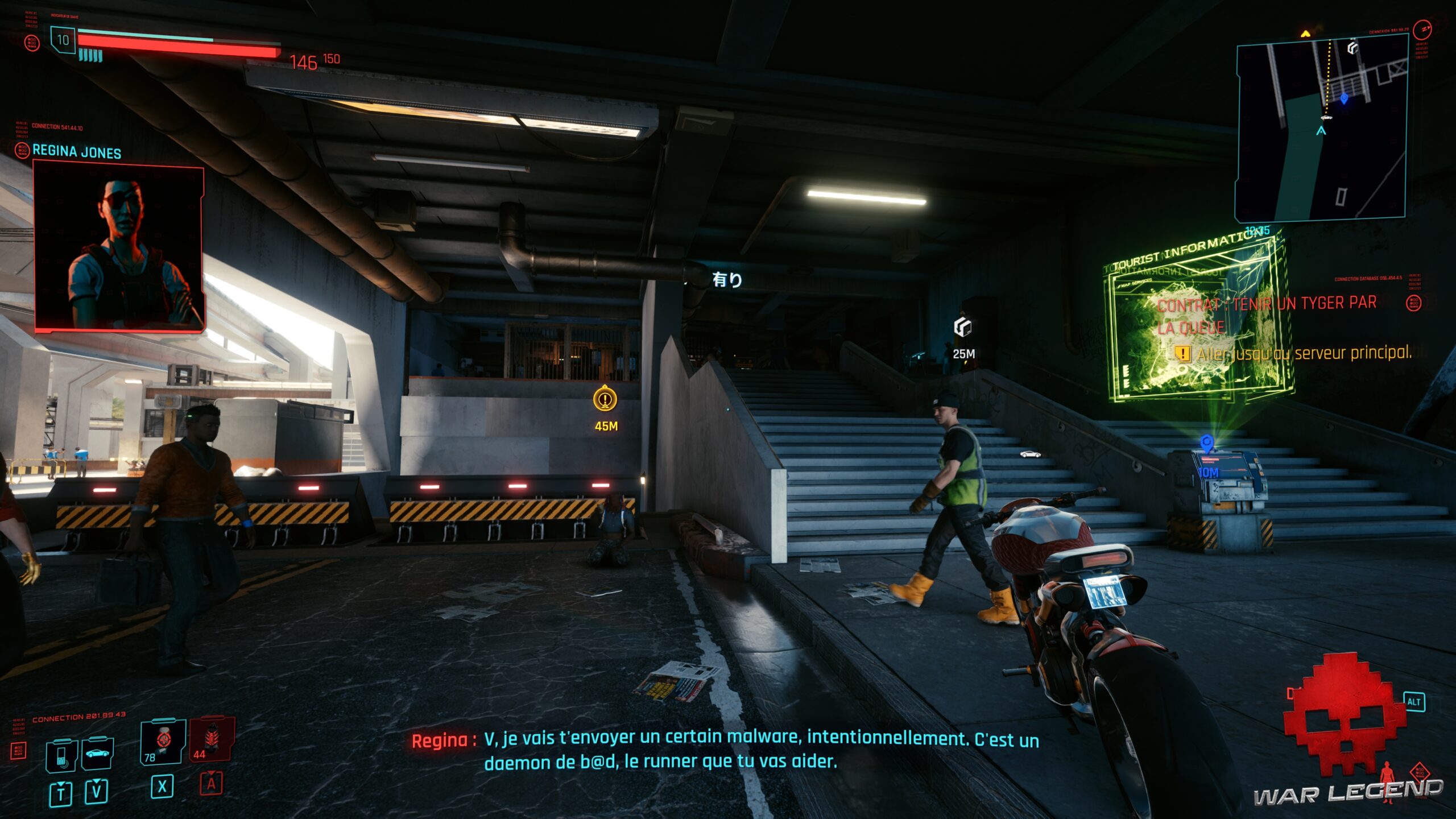 Après avoir descendu les escaliers et pénétré la salle principale, dirigez-vous vers la porte à l’est. Le terminal à pirater s’y trouve. Attention au NetRunner connecté dans son fauteuil.
