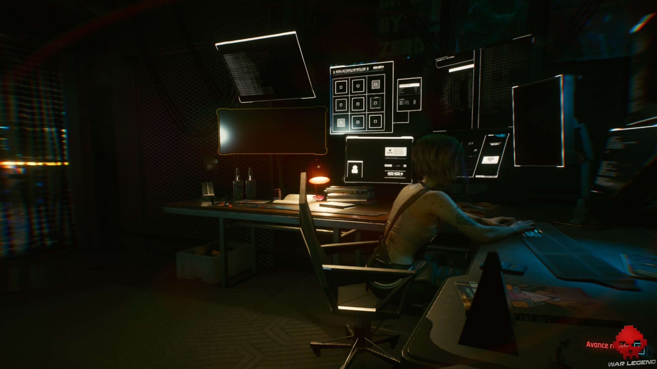 Rejoignez Judy dans son bureau et asseyez-vous sur le fauteuil à proximité pour explorer la première DS. Dans celle-ci, Evelyn est en entretien avec une netrunner.
