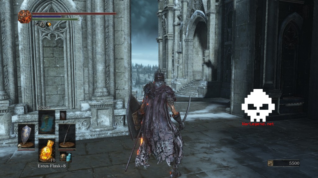 Montez les escaliers jusqu’à entrer dans ce qui fut la demeure de l’illusion de Gwenevere. Dans la pénombre, allez à droite et faites le tour jusqu’à l’autre escalier. Descendez en faisant attention de ne pas vous faire cramer les miches par les boules de feu envoyées par les évêques. Récupérez les Flèches de Clair de Lune (Moonlight Arrows) au passage puis, au rez-de-chaussée, abritez-vous derrière un pilier pour temporiser un peu.