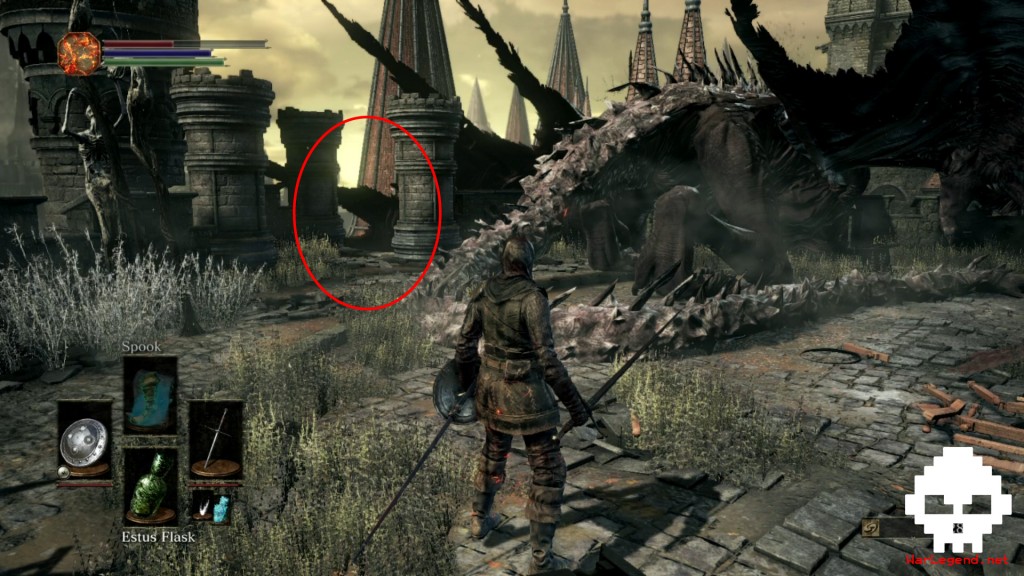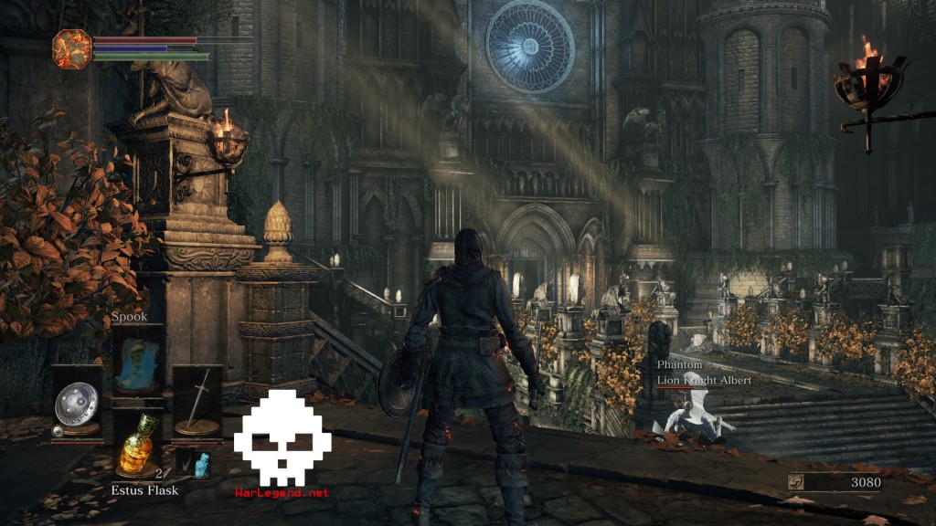 A la sortie du bâtiment, prenez à gauche. Finissez-en avec le chevalier et fouiller un corps pour trouver une « Lucerne ». Descendez ensuite les grands escaliers jusqu’au portail d’où filtre une lueur jaune-orangée. Préparez-vous à affronter le boss Vordt de la Vallée Boréale.