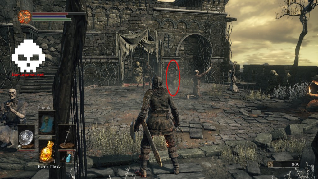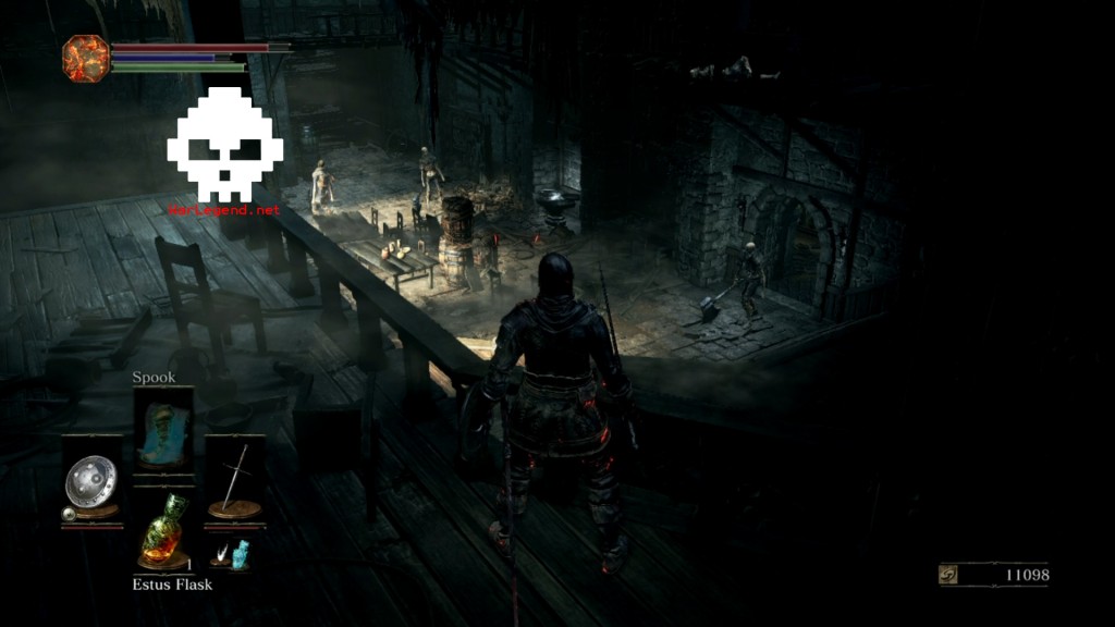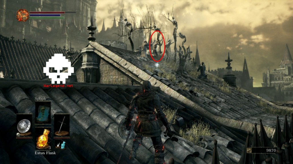 De là, retournez là où vous avez affronter les arbalétriers mais au lieu de vous engager là, prenez à gauche et optez pour le toit. Trois Bombes Incendiaires Noires (Black Firebombs) vous y attendent. Servez-vous en avec des Bombes Incendiaires (Firebombs) pour tuer l’ennemi en bas. Une fois que ses points de vie sont bas, sautez sur la petite toiture puis faites une attaque sautée pour l’éliminer.