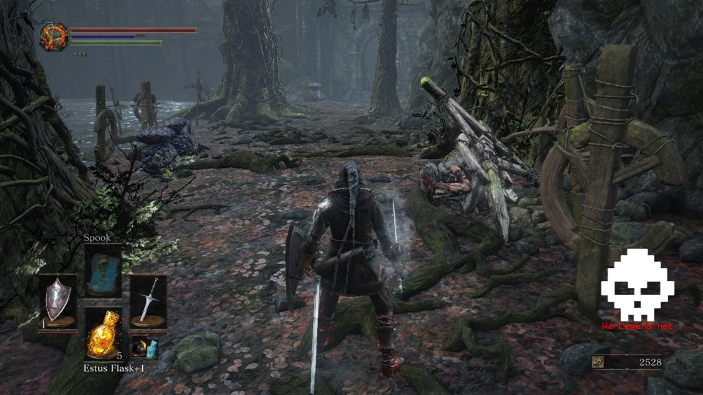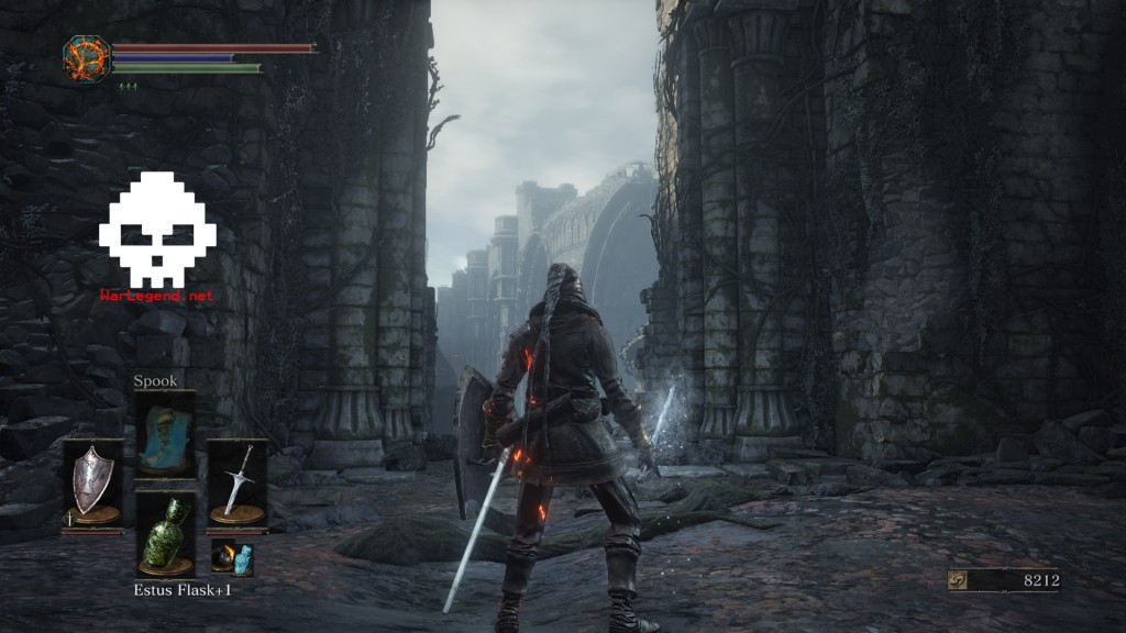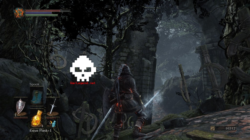 Un bâtiment en ruines pourvu d’une petite entrée à sa base vous tend les bras. Passez par sa gauche pour en faire le tour, éliminer des adversaires et récupérer du loot, dont une Braise (Ember) et un Fragment de Fiole d’Estus (Estus Shard). Ceci fait, entrez dans la bâtisse et récupérez le Bâton de l’Hérétique (Heretic’s Staff) après vous être chargé des ennemis (exécutez le type à la lanterne avant qu’il puisse réveiller ses amis).