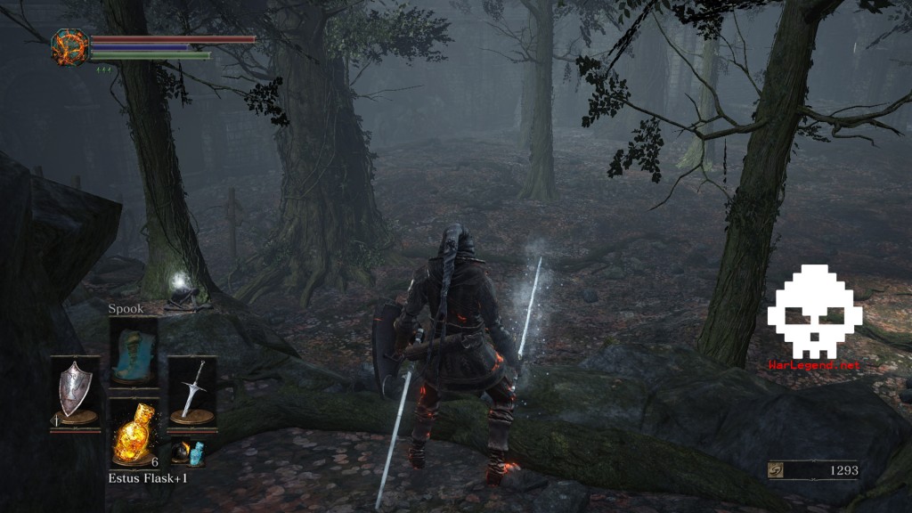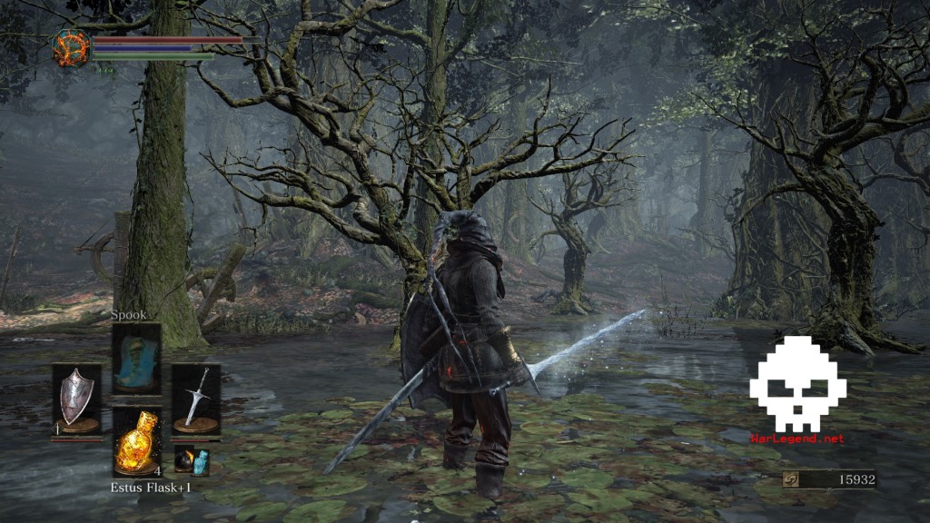 Fouillez ensuite le marrais pour récupérer les loots qui traînent, dont un Fragment de Titanite (Titanite Shard) au pied de la falaise d’où vous venez. Dans les eaux, vous allez mettre la main sur l’ensemble d’armure Conjurateur (Conjurator) ainsi que sur un Tome de Pyromancie du Grand Marais (Great Swamp Pyromancy Tome). Dès ce moment-là, un esprit sombre va vous envahir. Pas nécessairement dur à battre, il octroie la Pioche de Heysel (Heysel Pick) et la Couronne de Xanthome (Xanthuous Crown) à sa mort.