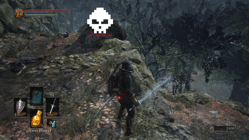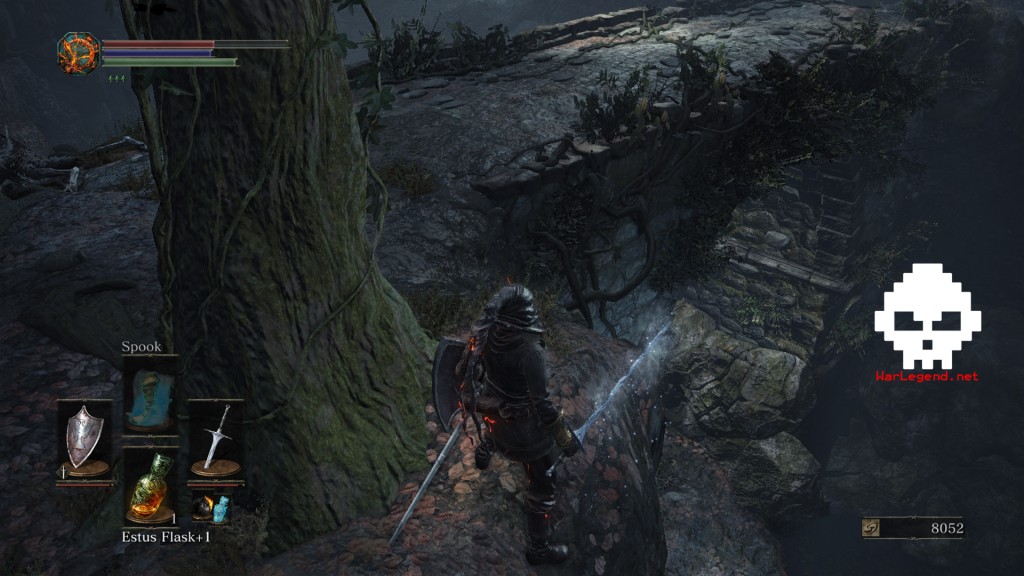 Continuez votre route, explosez les deux piafs et leur copain sorcier. Vous allez voir un pont vous offrant la possibilité de passer dessous. Avant ça, partez à gauche, derrière le gros rocher. Vous serez attaqué par quelqu’un qui ressemble à s’y méprendre à Mildred de Dark Souls. Tuez-la pour récupérer son Saignoir (Butcher’s Knife). C’est également derrière le rocher que vous trouverez la Hache de Brigand (Brigand Axe), les Dagues de Brigand (Brigand Twindaggers) et l’ensemble d’armure complet du Brigand.