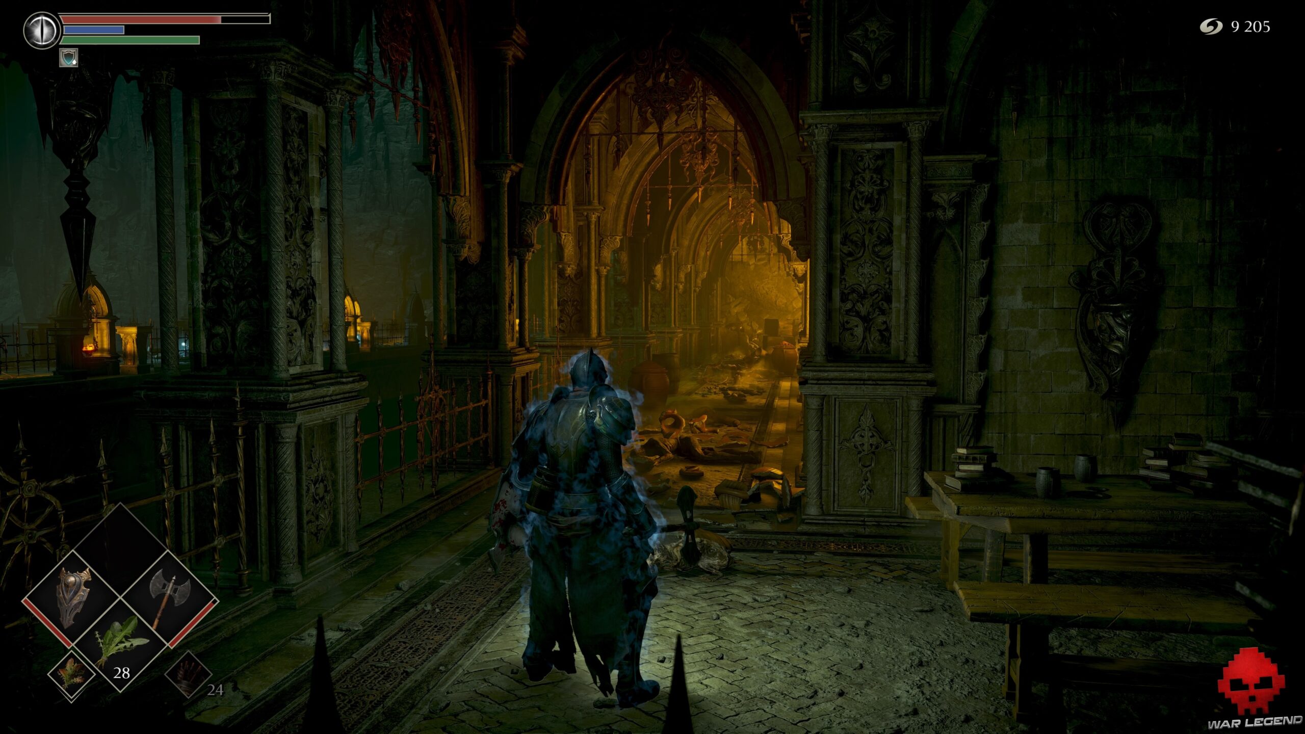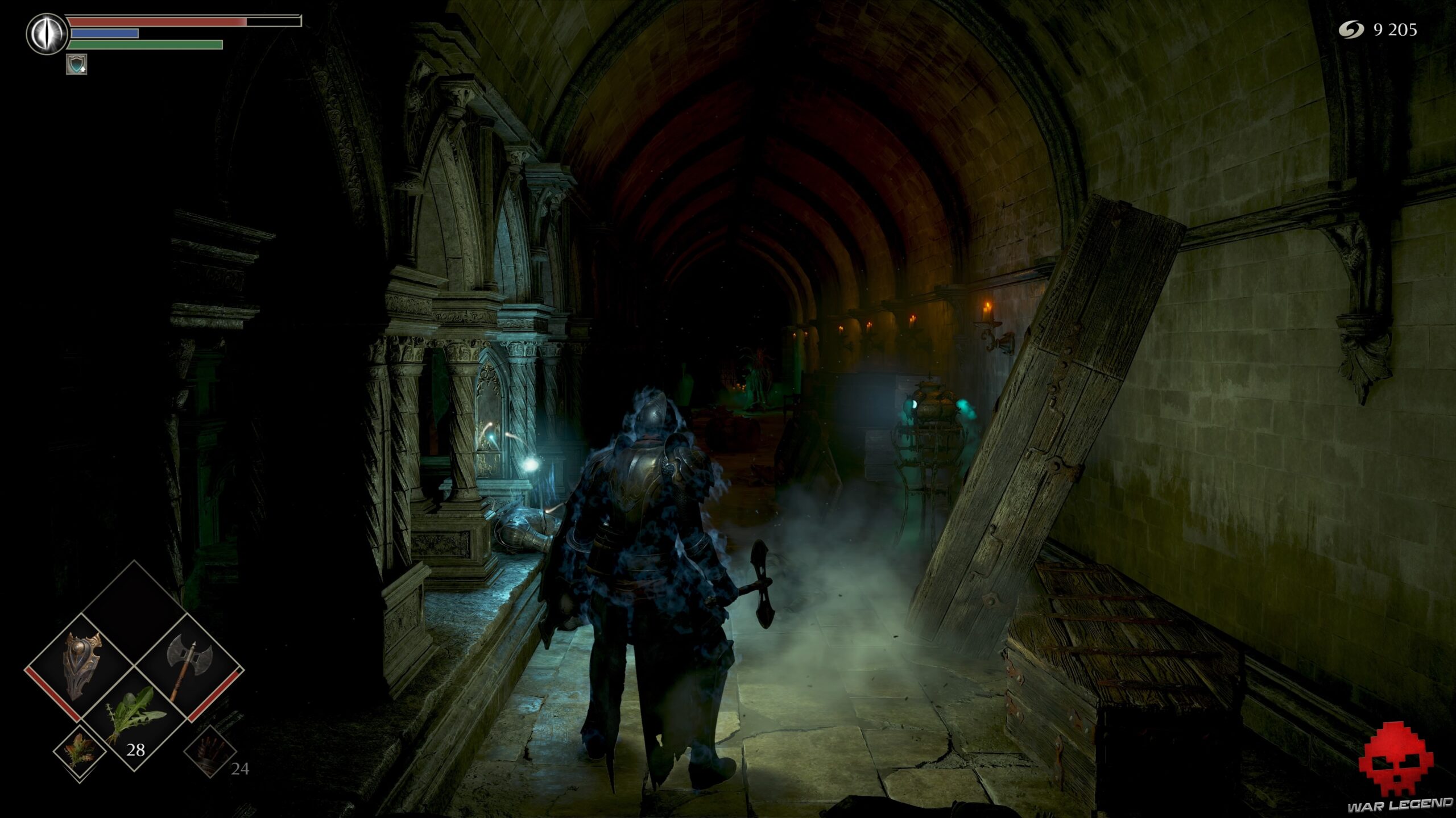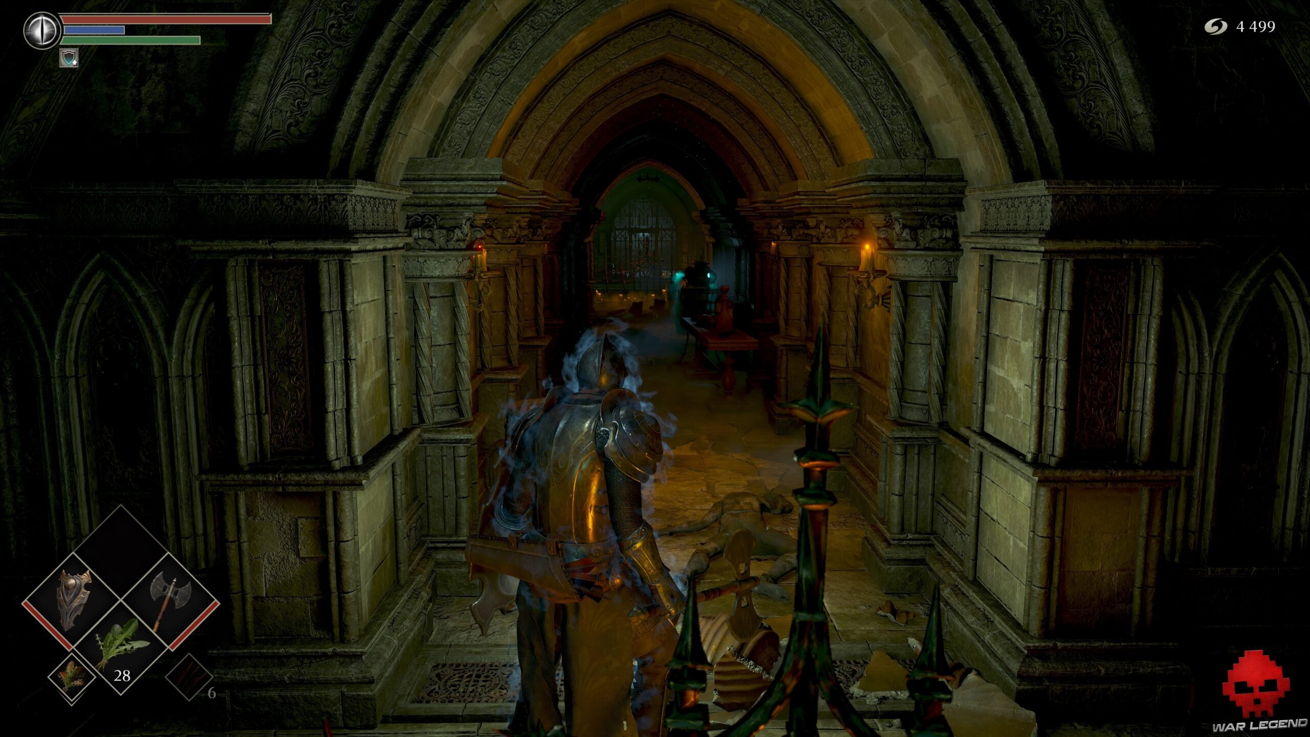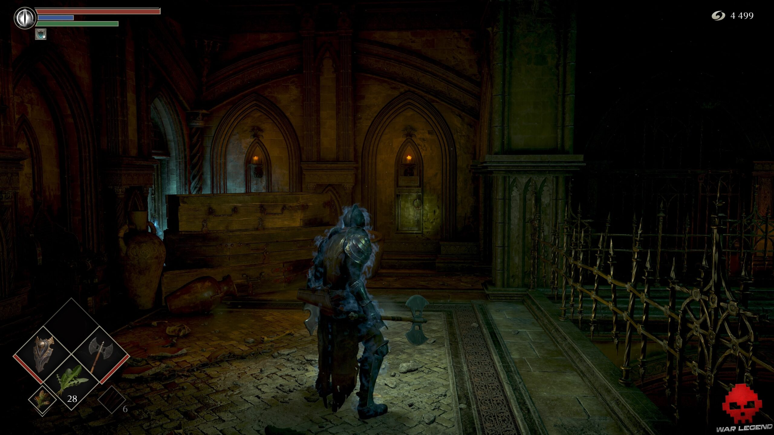 Prenez à gauche sur un nouveau chemin de ronde et, arrivé au fond à droite, éclatez les cercueils qui obstruent une porte ouverte. Vous obtenez ainsi un accès avec 1 Éclat de pierre de lune et 1 Estoc.