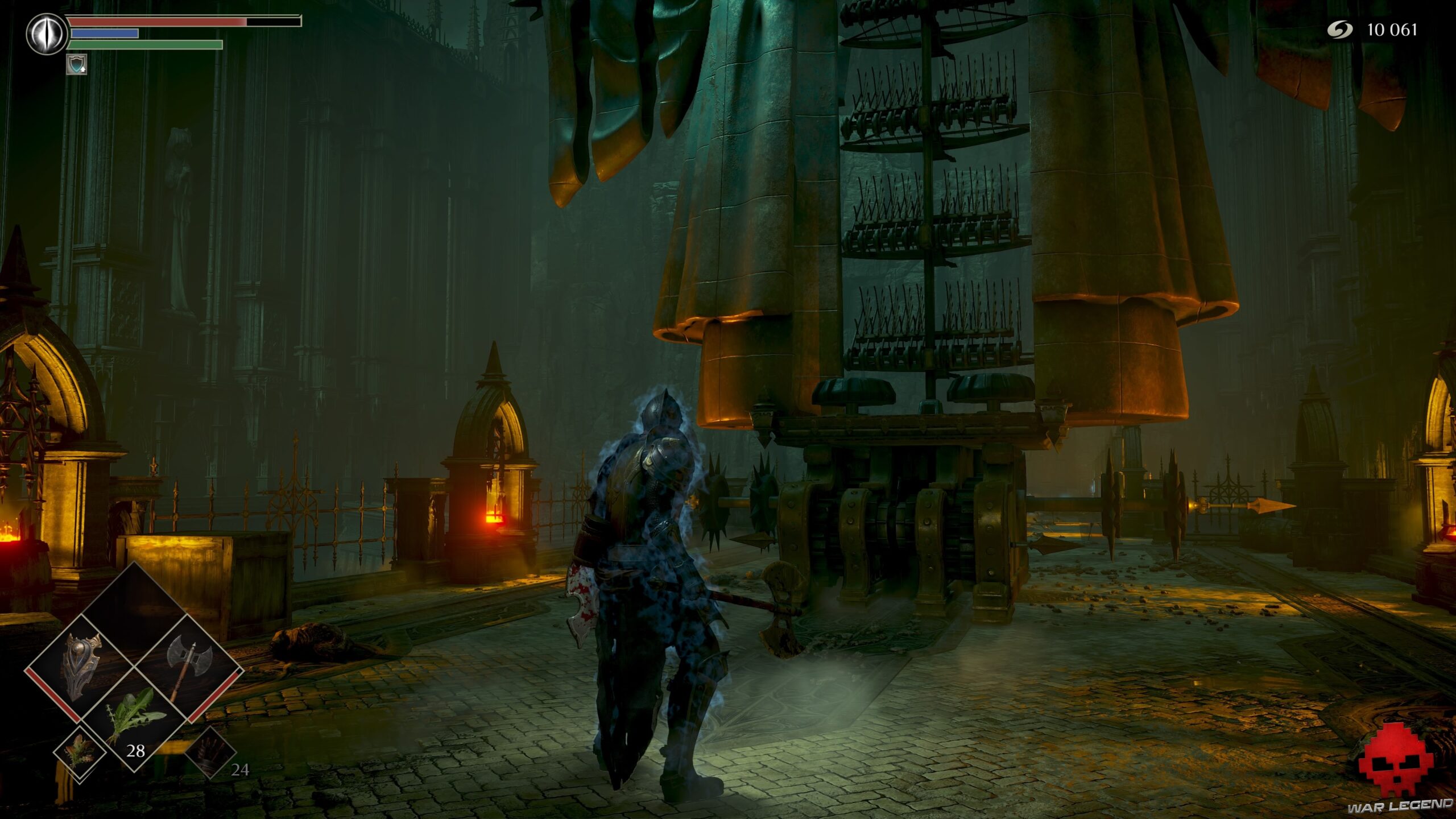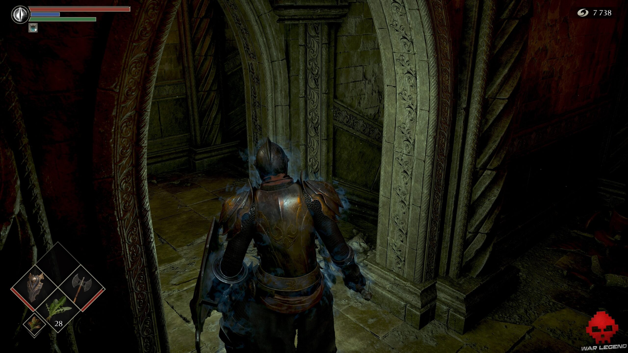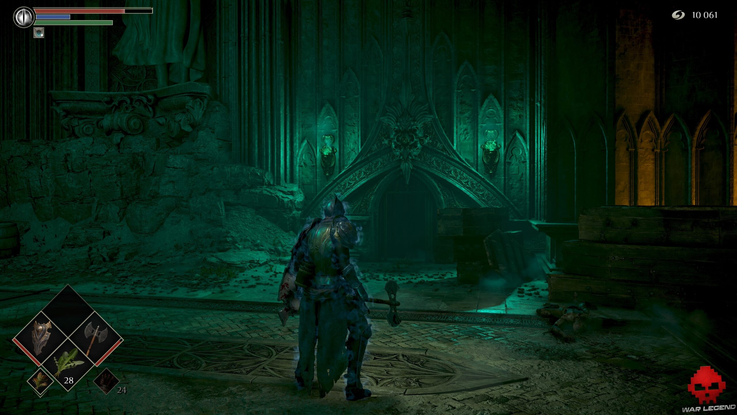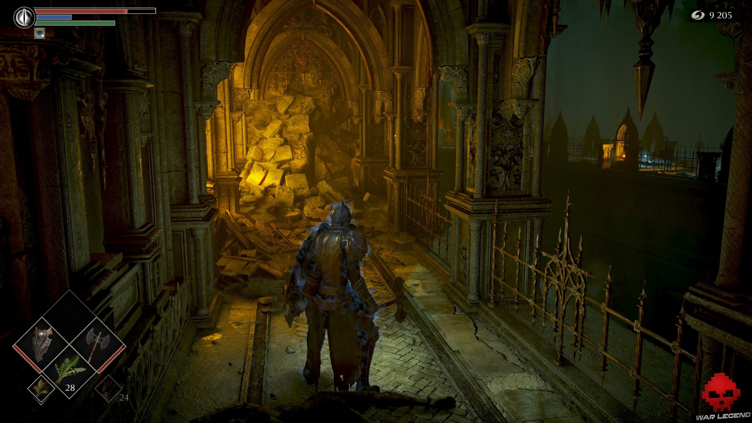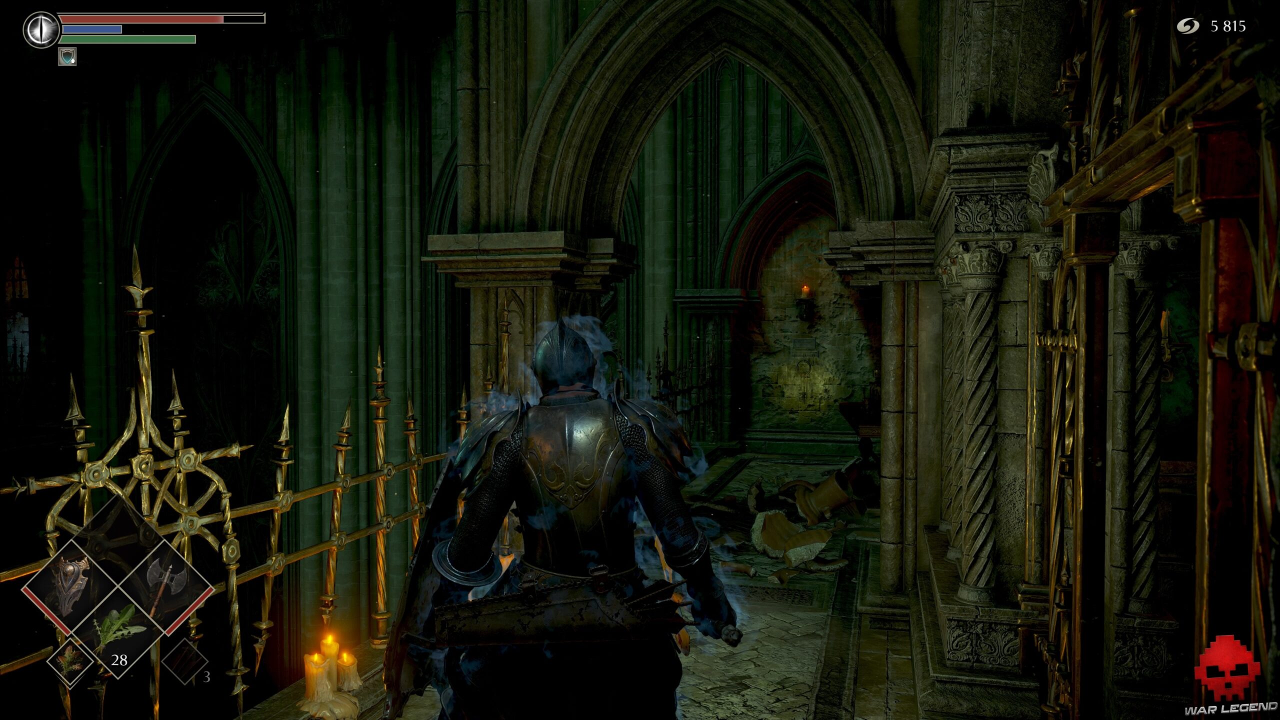 Prenez à gauche sur un nouveau chemin de ronde et, arrivé au fond à droite, éclatez les cercueils qui obstruent une porte ouverte. Vous obtenez ainsi un accès avec 1 Éclat de pierre de lune et 1 Estoc.