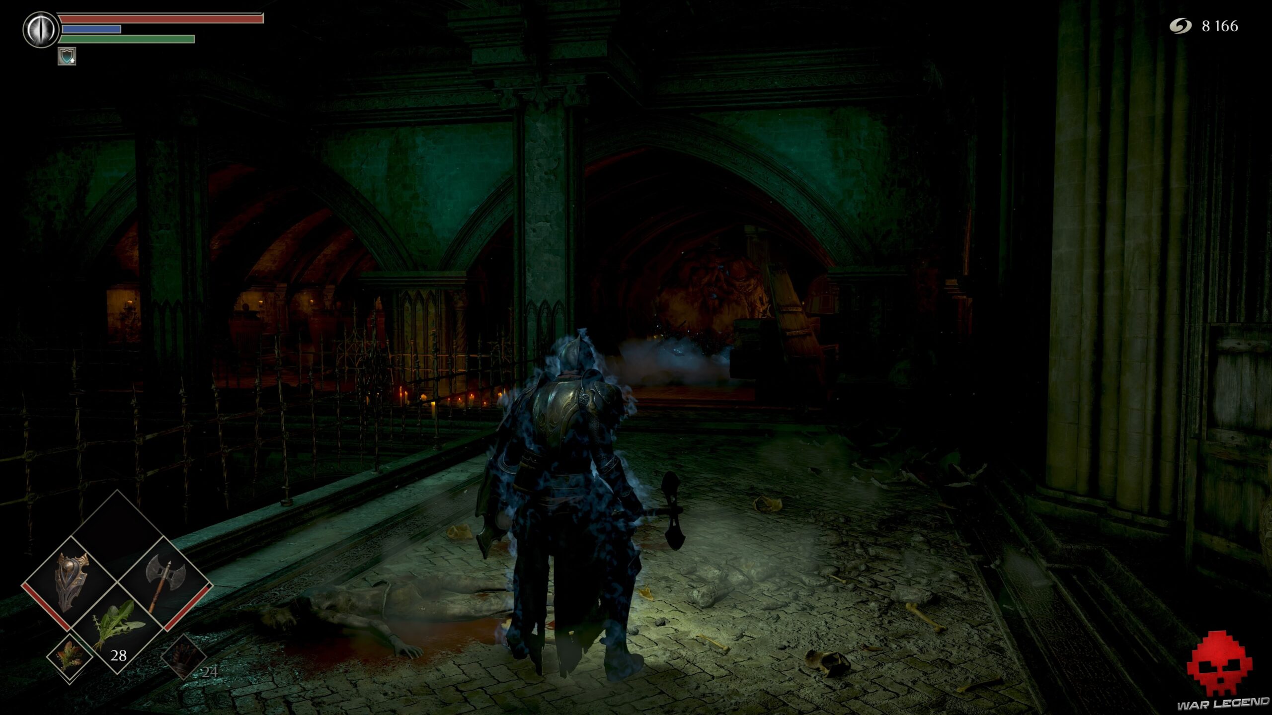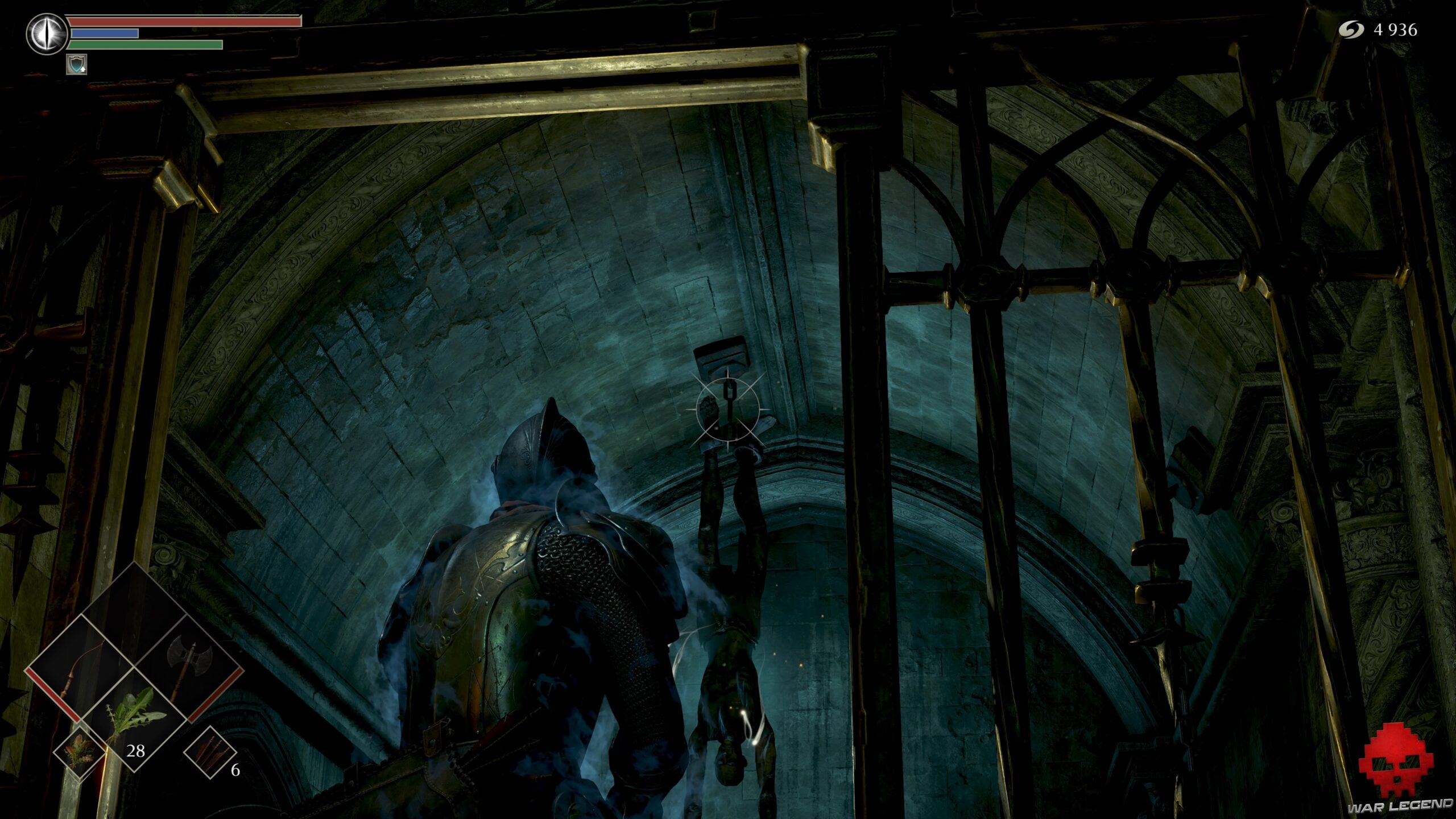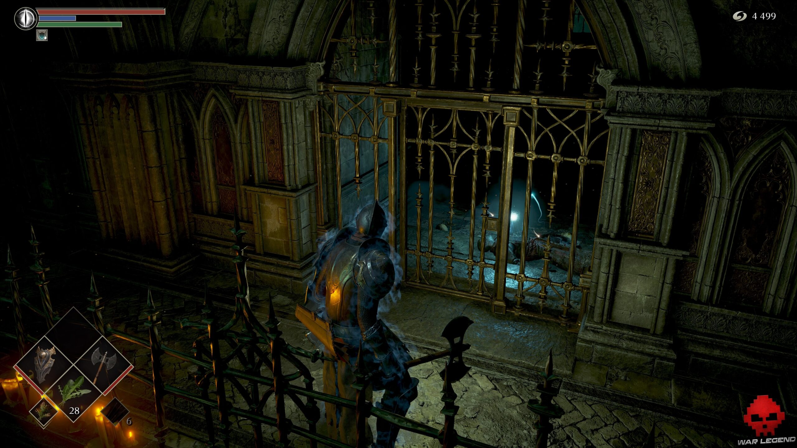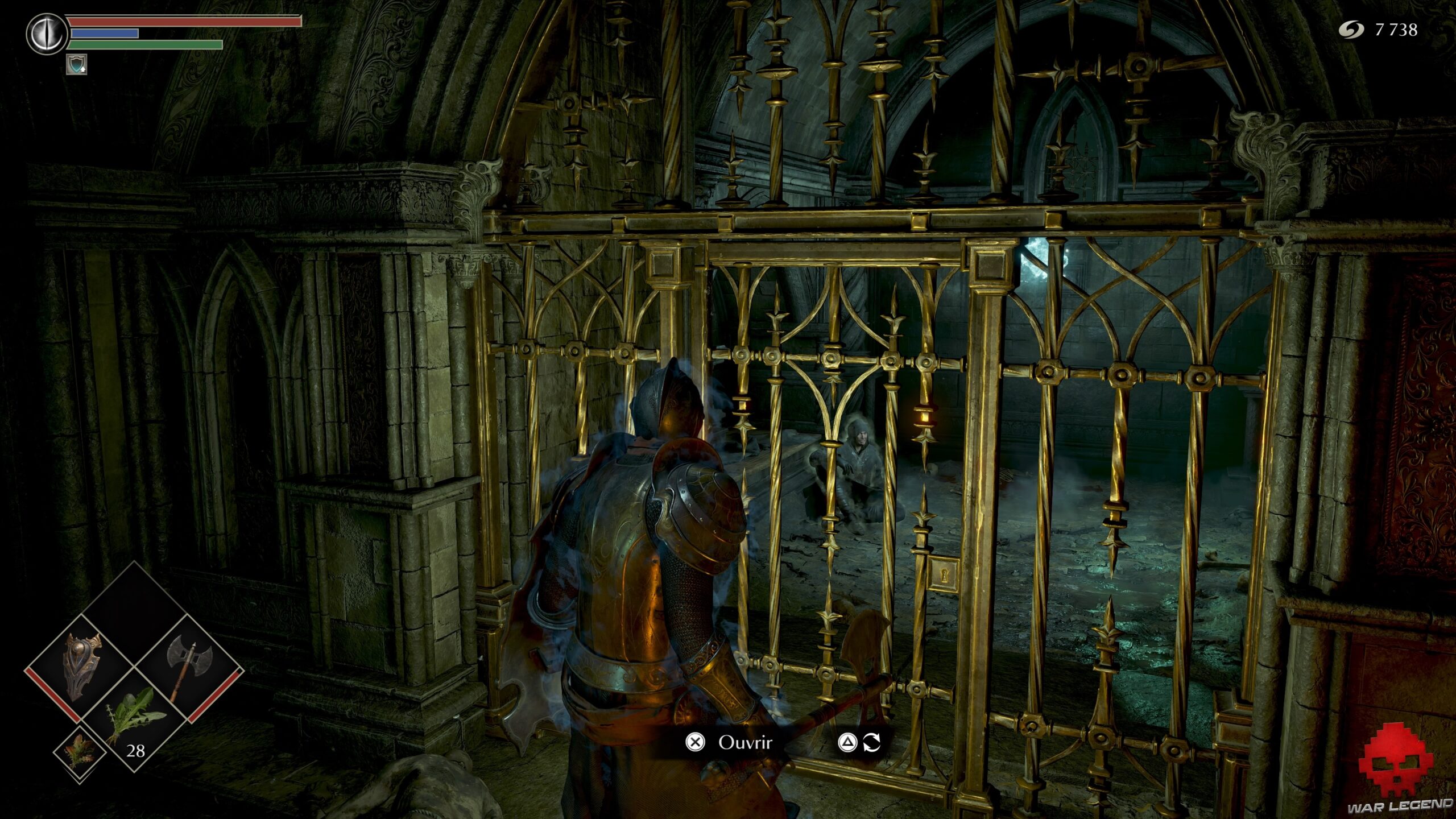 Vous ne pourrez plus rien ouvrir sans nouvelle clé. Poursuivez votre route jusqu’à trouver une cellule dépourvue de porte. Le corps accroché au plafond cache 1 Eau claire, tandis que la vierge de fer de droite contient 1 Âme du héros inconnu. Celle de gauche permet d’obtenir le set d’Assassin.