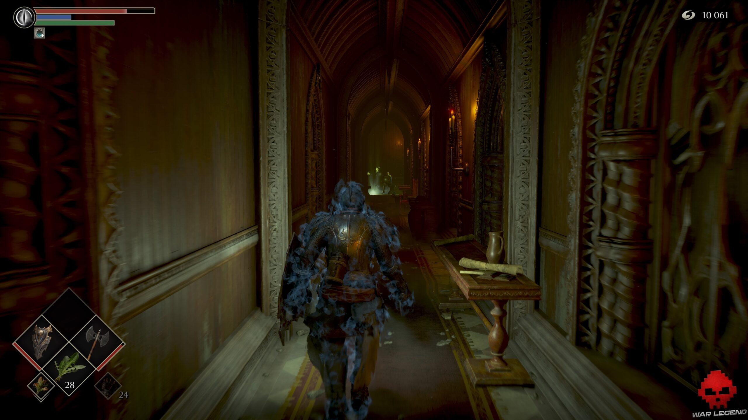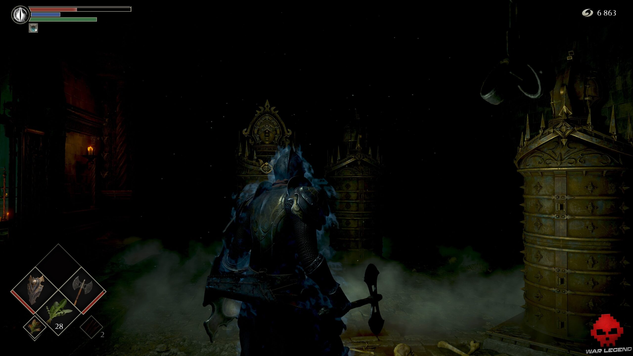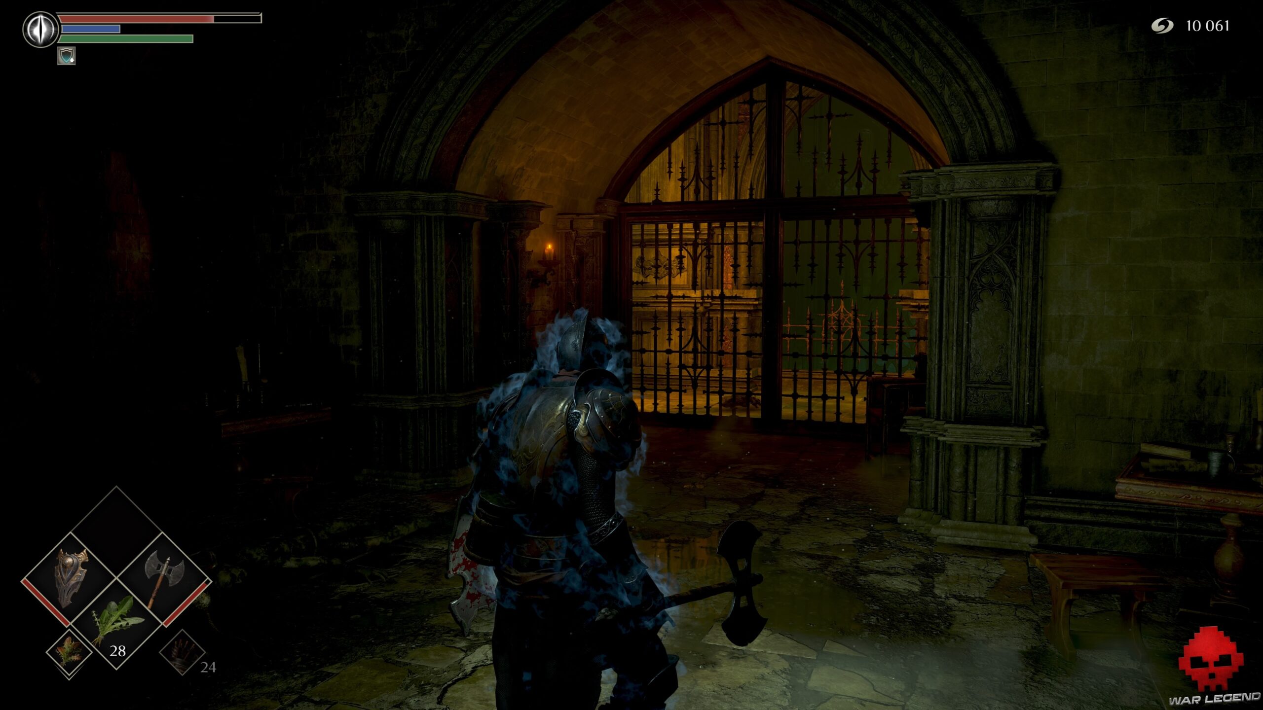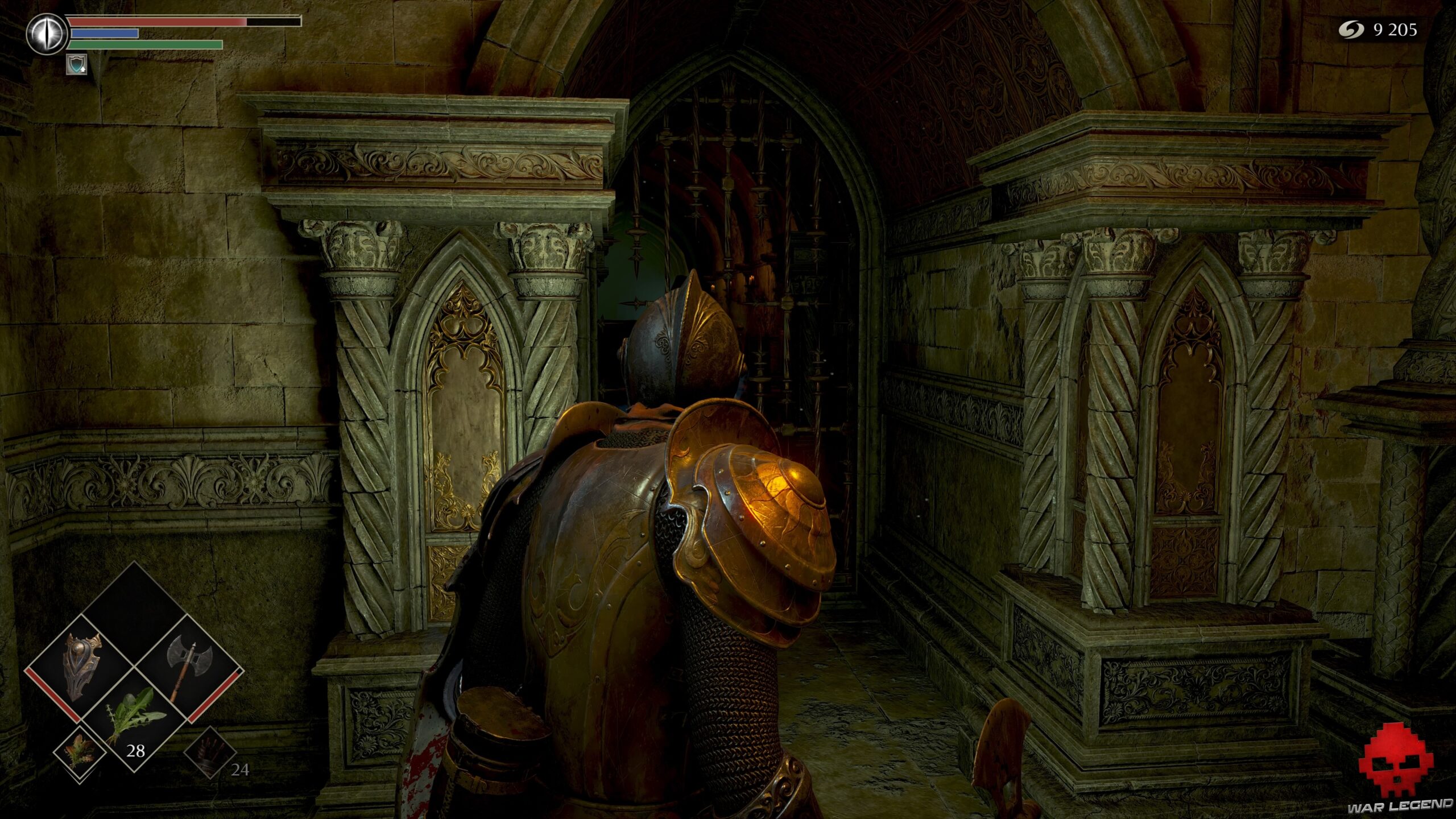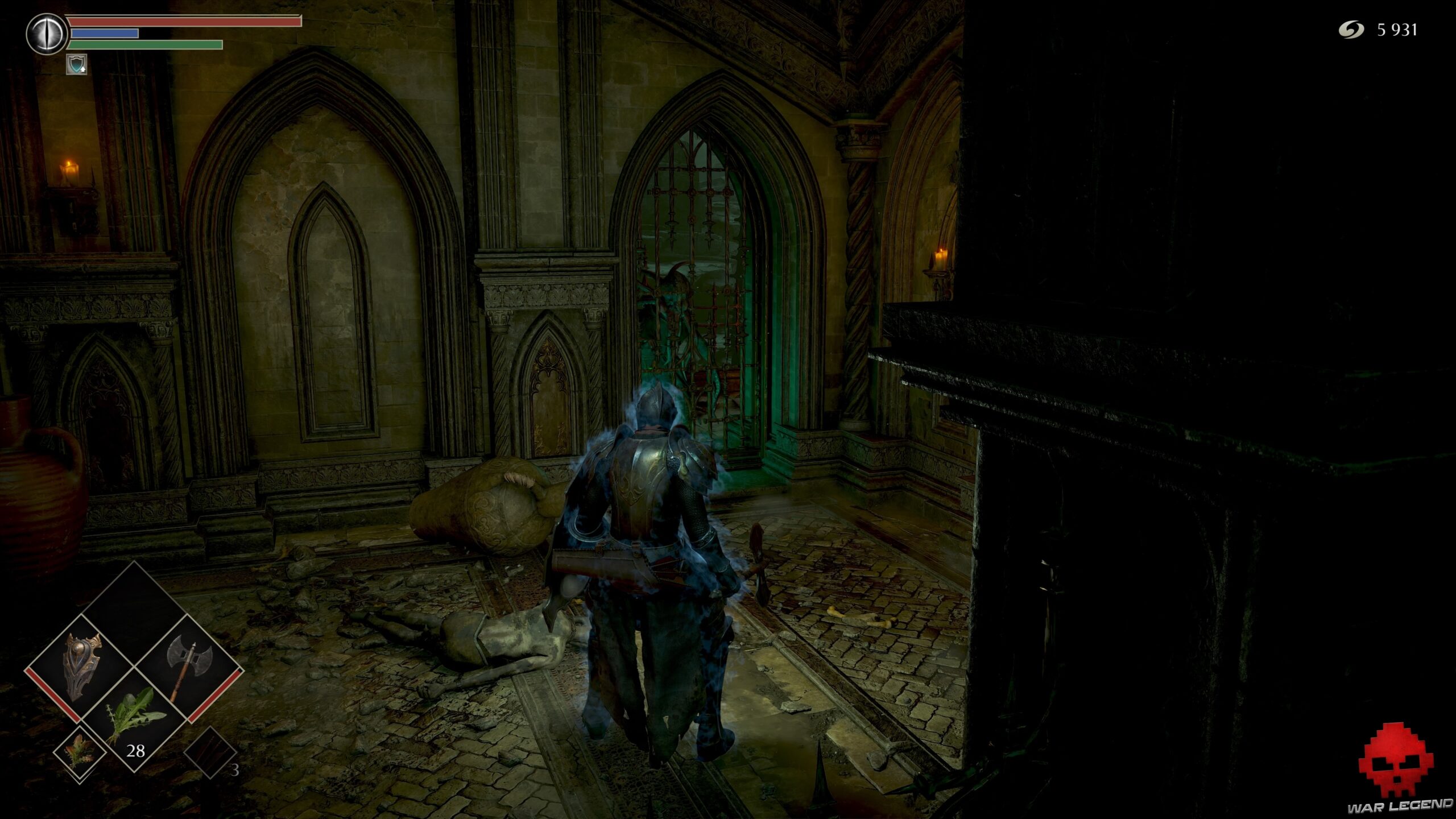Vous ne pourrez plus rien ouvrir sans nouvelle clé. Poursuivez votre route jusqu’à trouver une cellule dépourvue de porte. Le corps accroché au plafond cache 1 Eau claire, tandis que la vierge de fer de droite contient 1 Âme du héros inconnu. Celle de gauche permet d’obtenir le set d’Assassin.