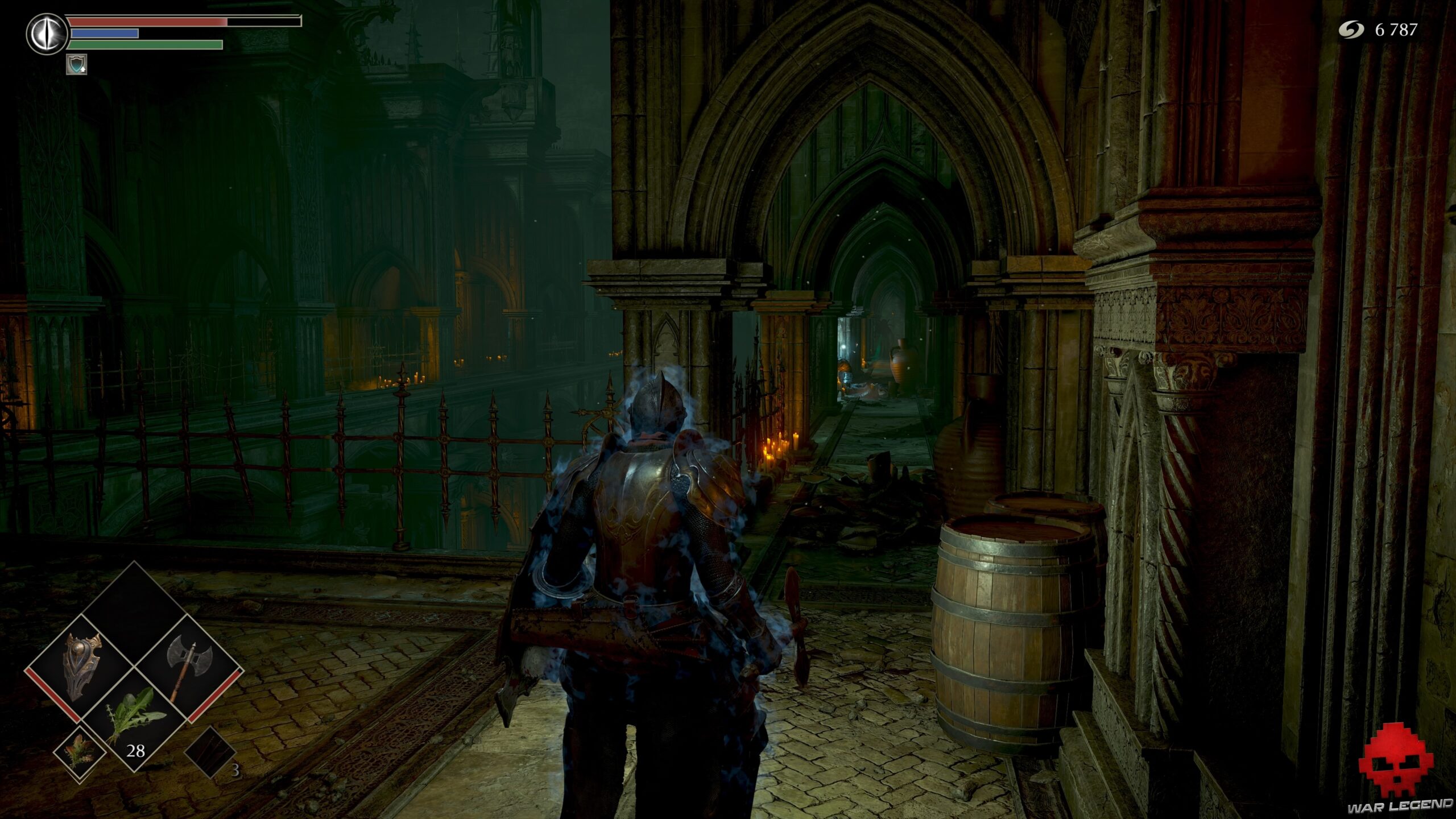 Soulevez une nouvelle grille, descendez les escaliers et passez le brouillard. Vous trouverez sur le seuil suivant 1 Arbalète lourde et 9 Carreaux noirs.