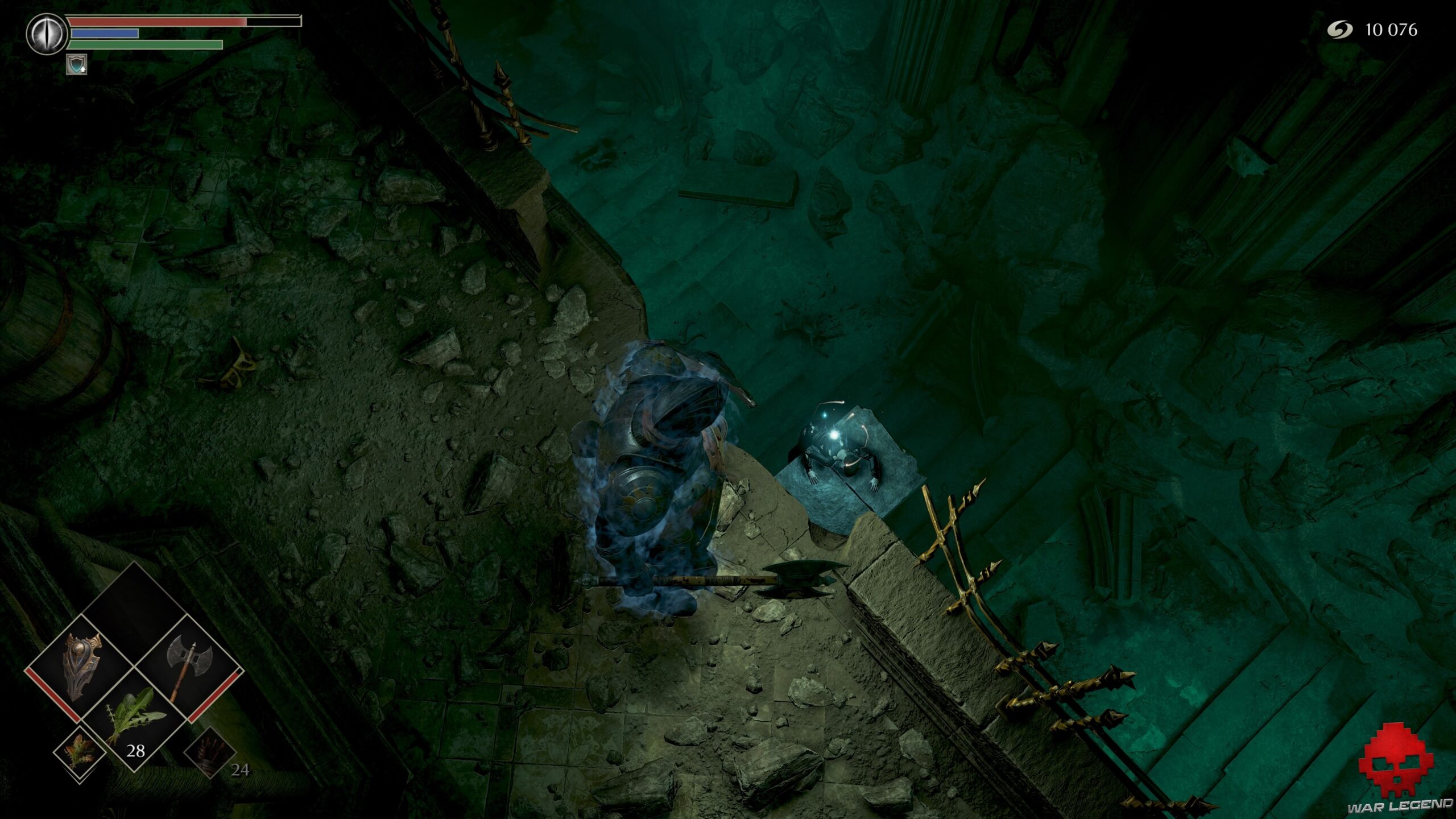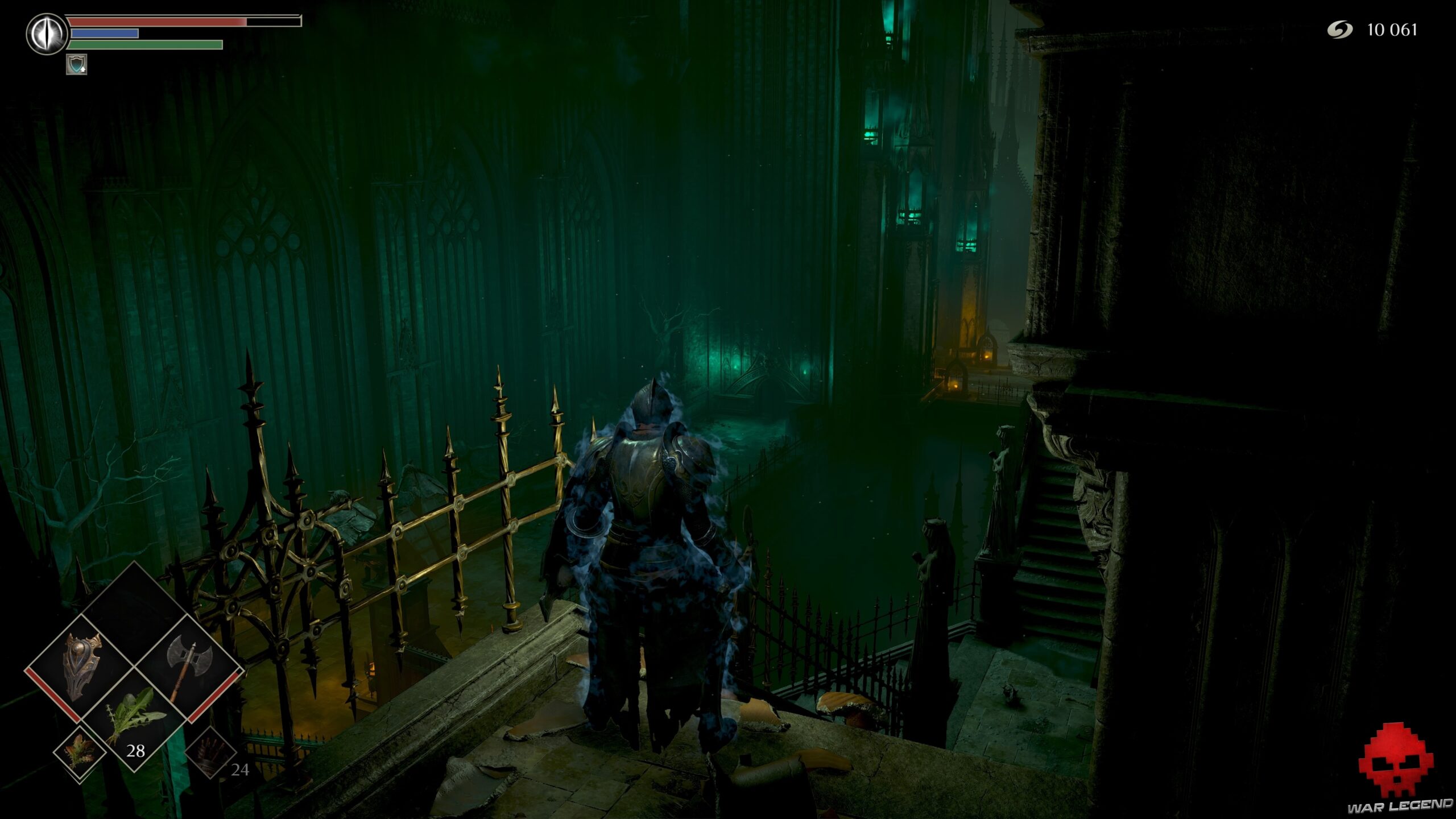 Tuez le poulpe plus loin et récupérez la Clé du 3e étage de la prison de l’espoir au mur. Vous pouvez finir votre petit tour du propriétaire pour aller récupérer 1 Éclat de pierre de mercure et 1 Âme de l’illustre soldat. Attention cependant à la seconde cellule de ce côté du chemin, où des prisonniers vont vous piquer avec des lances.