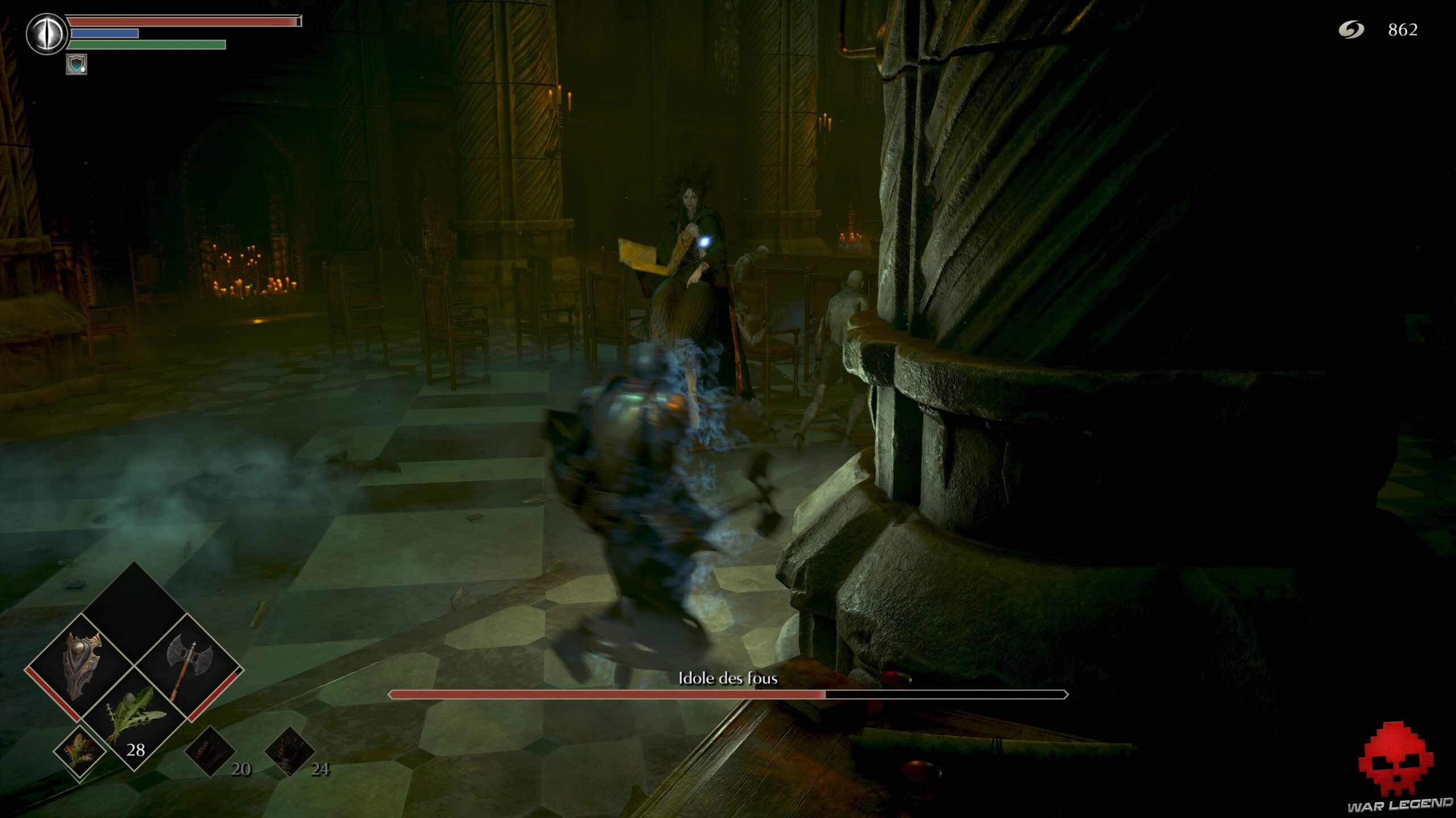 L’idole des fous est un lanceur de sorts qui va se cloner pour pouvoir vous cribler de flèches d’âme. Il faut surtout faire attention aux pentacles qu’elle va invoquer au sol : si vous marchez dedans, vous serez paralysé durant quelques secondes, ce qui vous rendra extrêmement vulnérable.