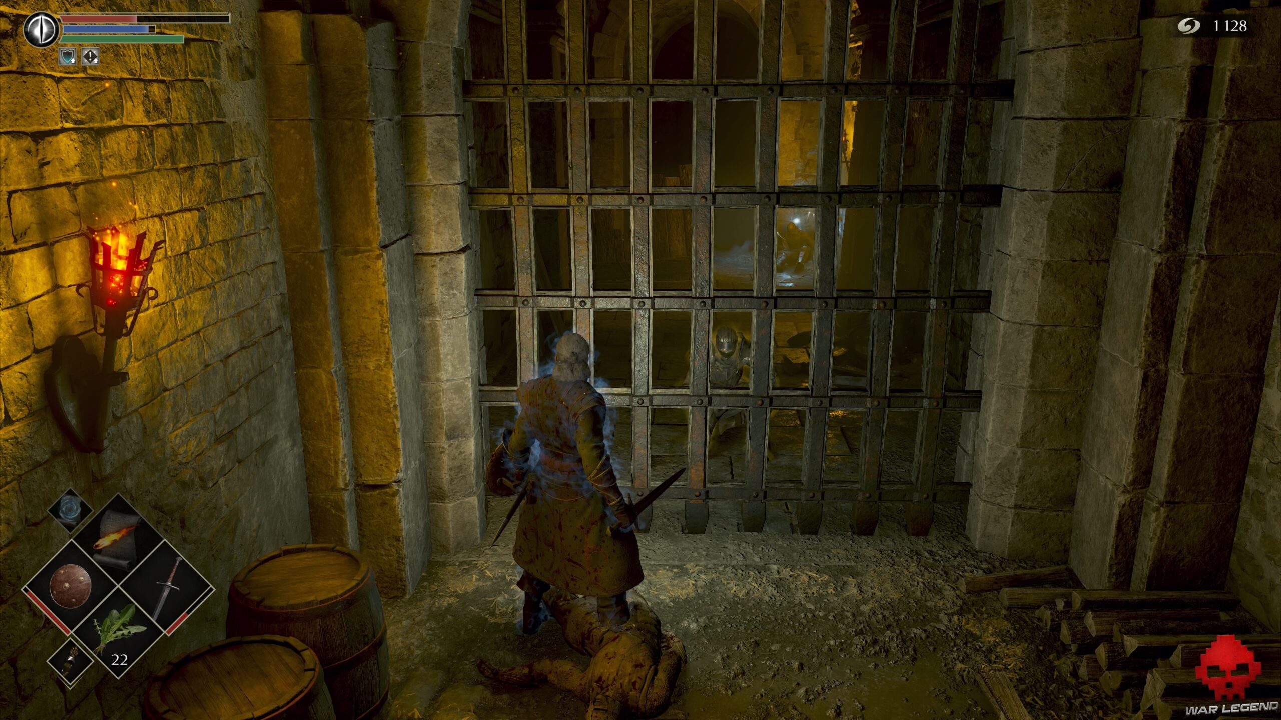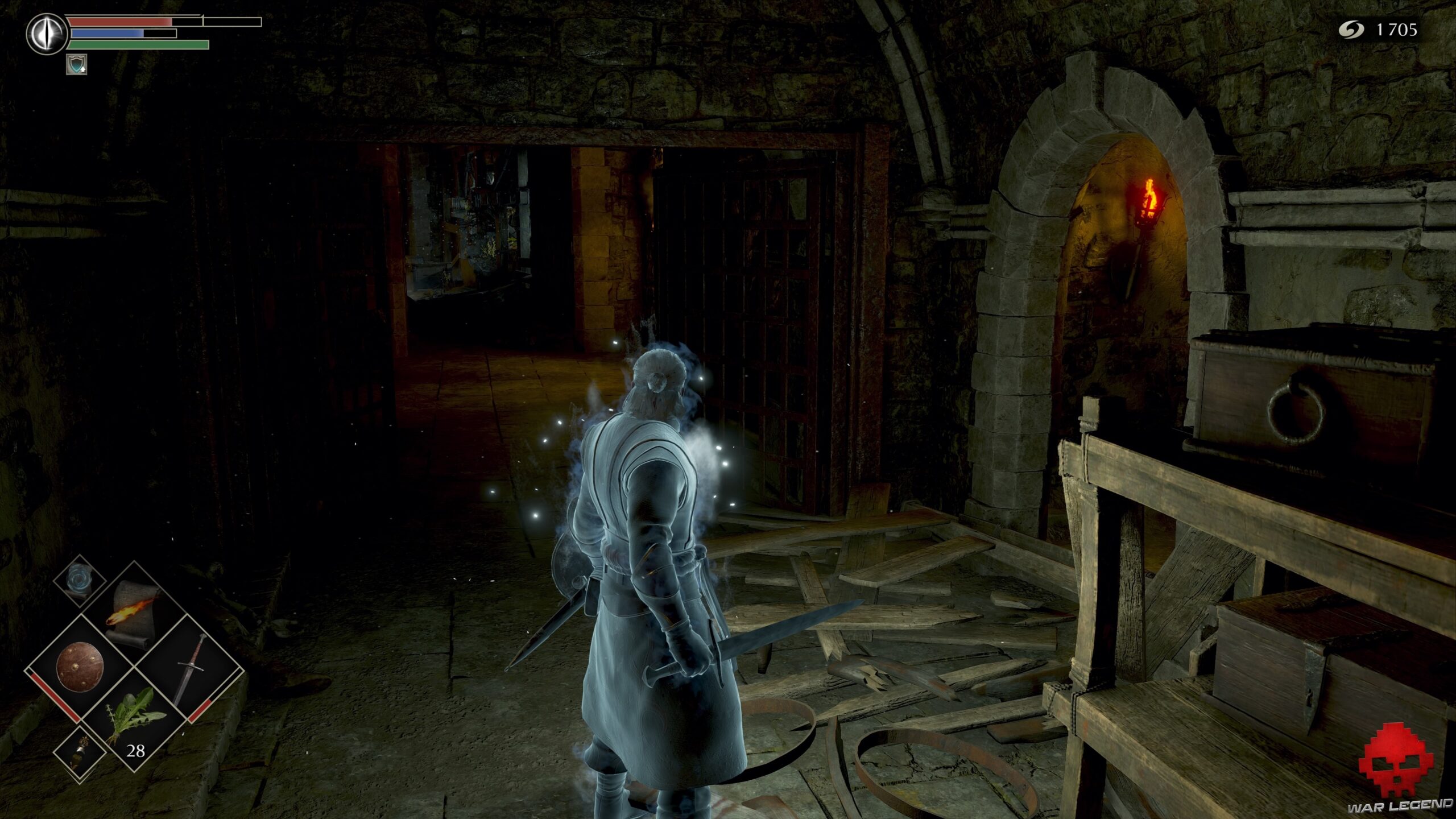À l’intérieur prenez à gauche pour trouver un escalier menant au sommet. Tuez les 4 soldats et récupérez le Catalyseur en bois ainsi qu’1 Âme du héros inconnu. Descendez ensuite au sous-sol via l’escalier et tournez à gauche. Lorsque vous arrivez à une première palissade faites attention car un ennemi attend sur la gauche pour vous prendre en embuscade. Éliminez la foule d’arbalétriers qui vous sépare d’Oswald, en récupérant au passage 1 Anneau d’hémostasie et 1 Cuirasse de chevalier bleu. Parlez ensuite à Oswald pour qu’il vous remette 3 Herbes de la lune sombre. Faites volte-face et suivez le long couloir.