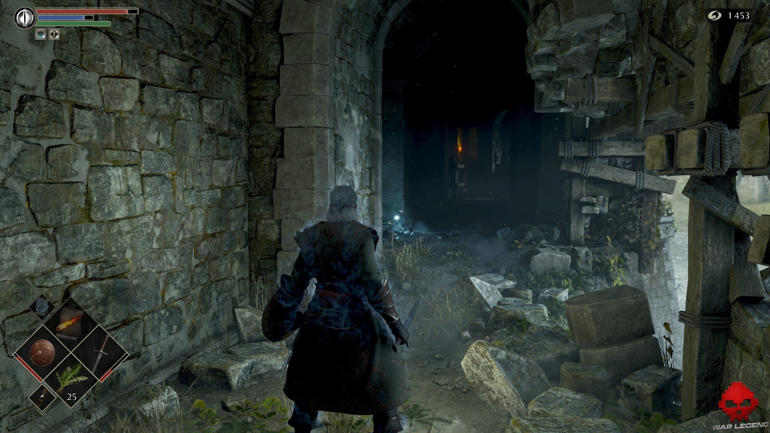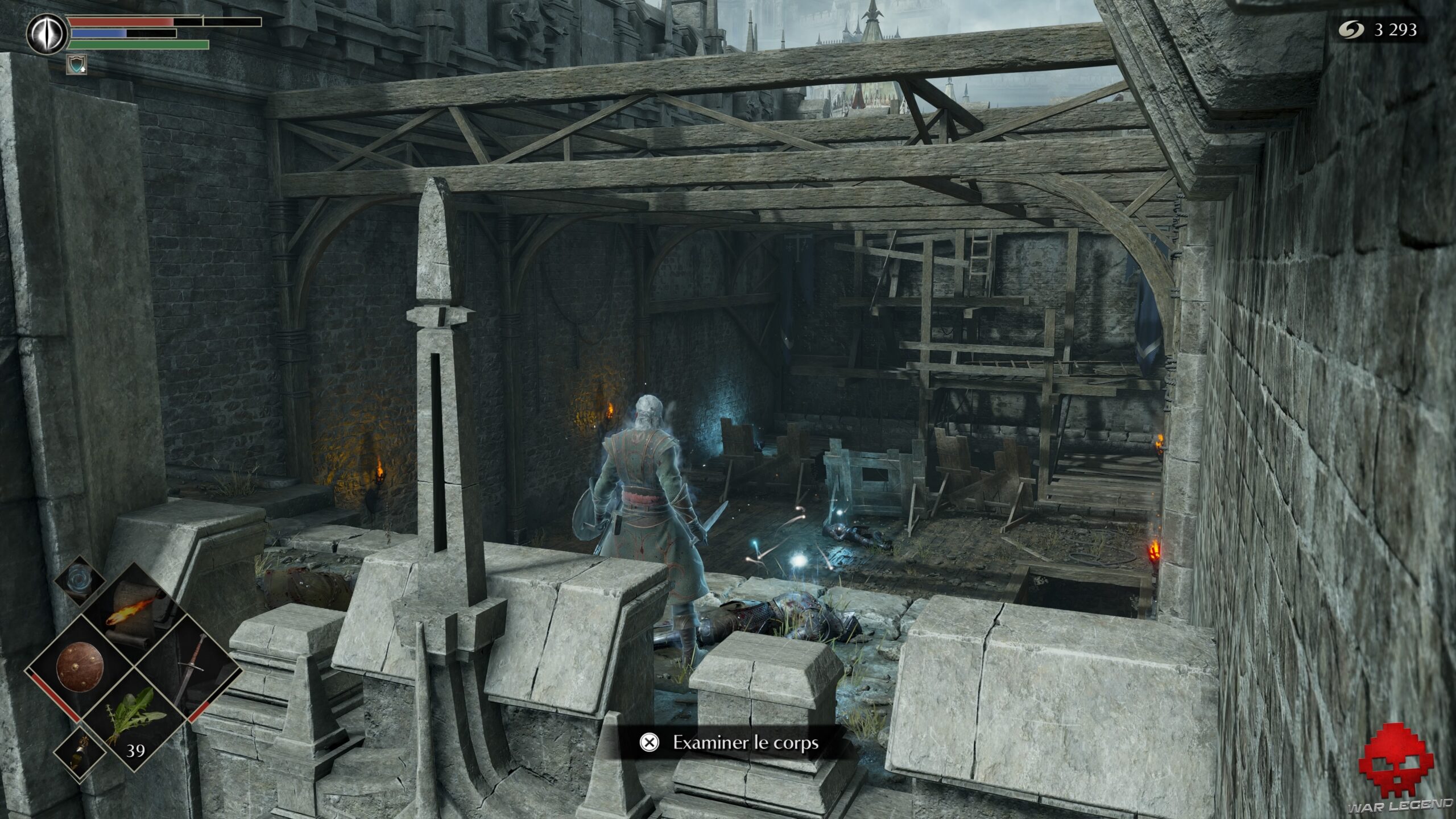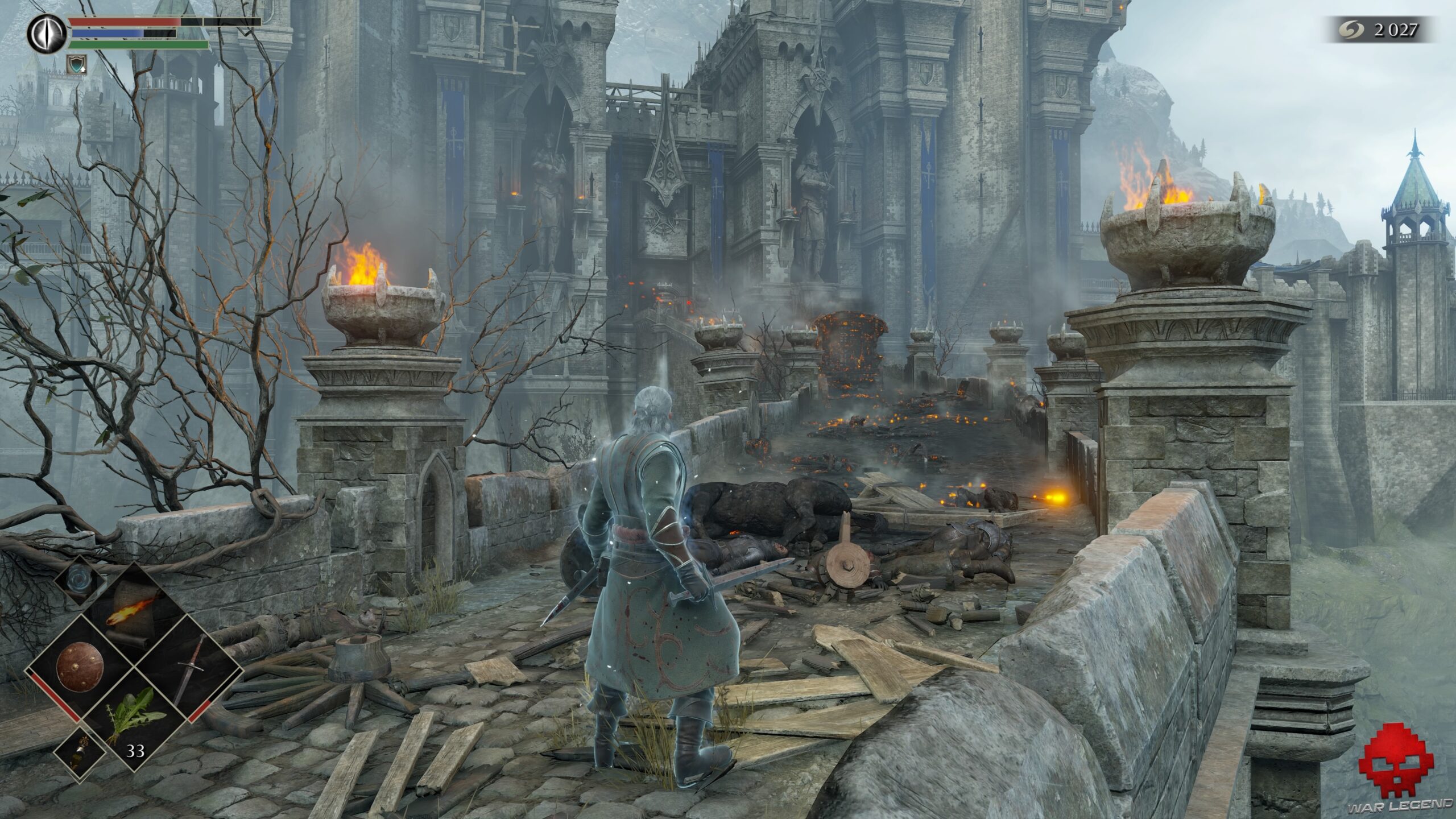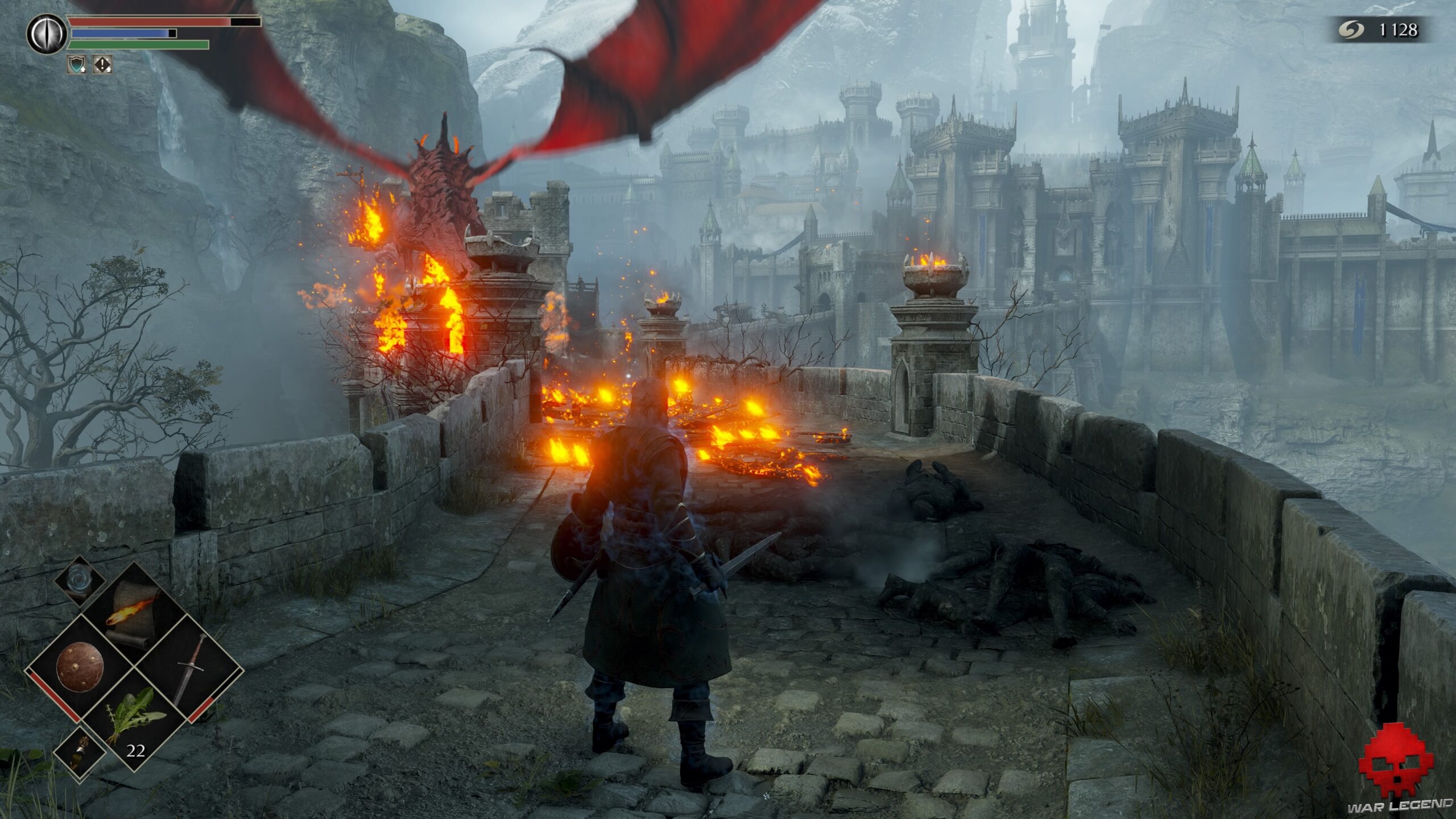 Sur la gauche, 4 arbalétriers ont réchappé aux flammes. Si vous attendez que le dragon fasse un passage, vous aurez le temps de sprinter pour récupérer 1 Âme de l’illustre héros sur le pont. Revenez ensuite à la tour et poursuivez votre chemin à travers le brouillard.