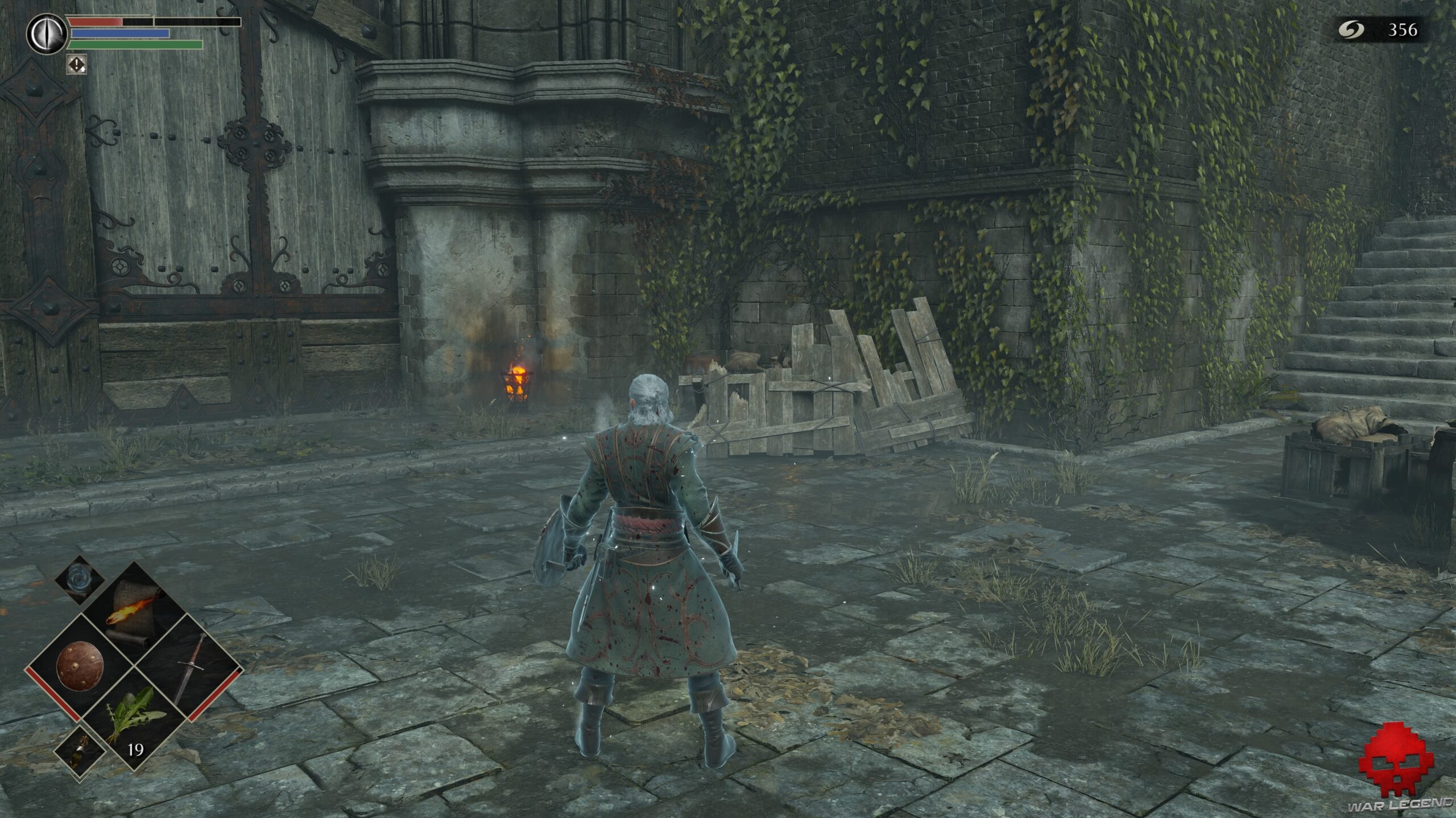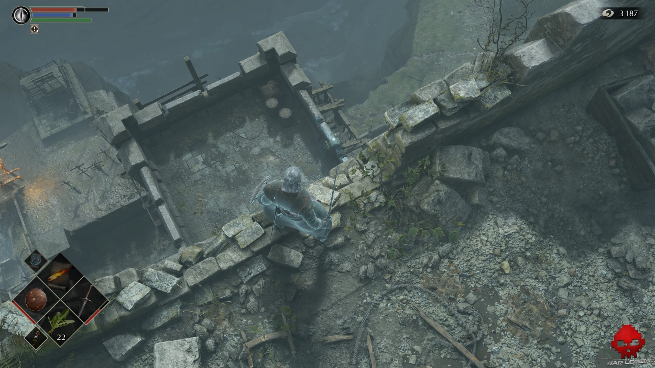 Commencez par vous retourner et allez récupérer 2 Herbes de lune descendante sur un cadavre entre des palissades. Montez ensuite les escaliers en prenant soin d’éliminer tous les adversaires qui vont surgir de part et d’autre du chemin.